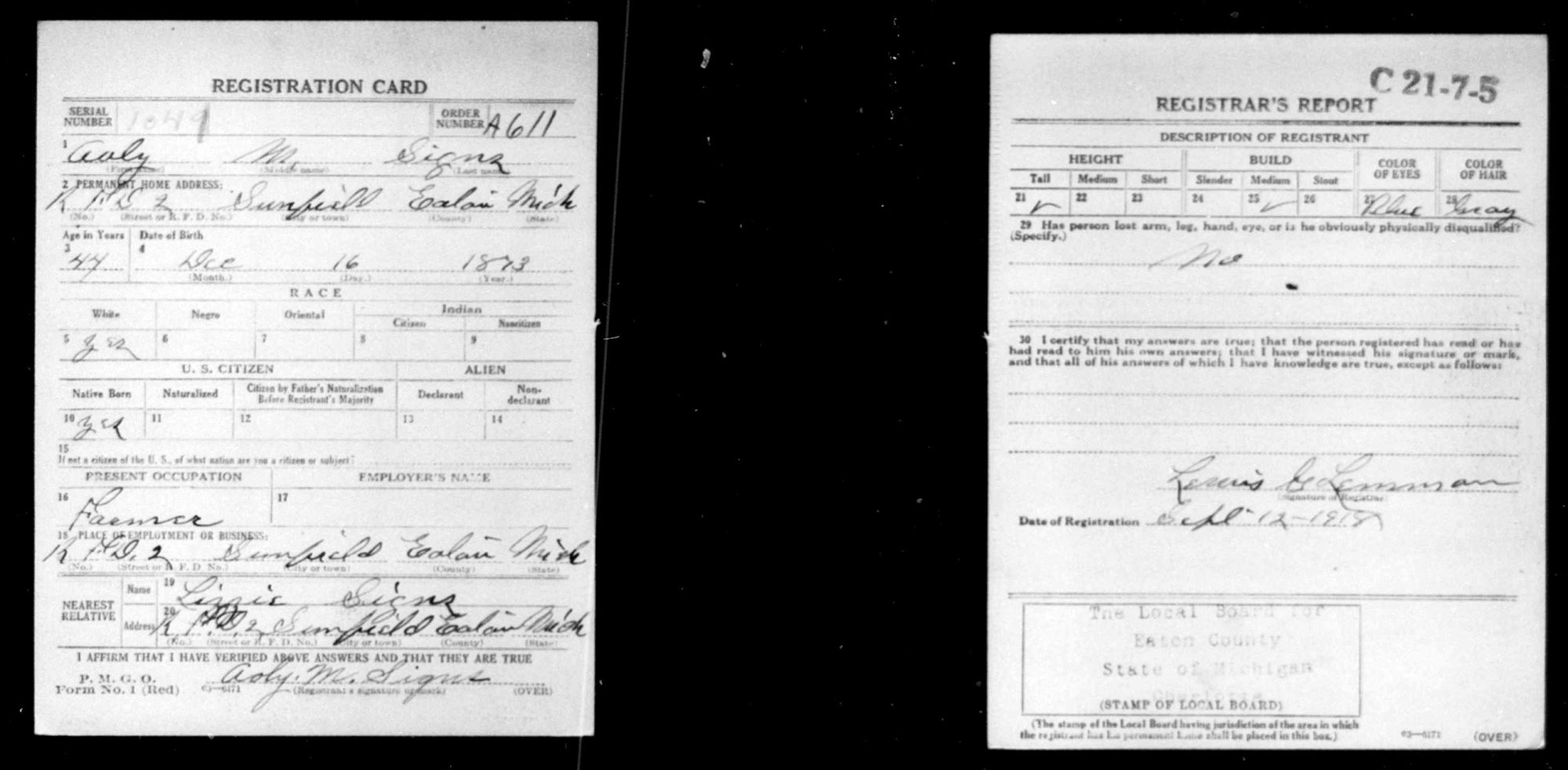 • On 12 September 1918, he registered for the World War I Draft at , Eaton County, MI. • He appeared on the 1920 US Census in Sunfield Township, Eaton County, MI on 19 January 1920. 3 • He appeared on the 1930 US Census in Sunfield Township, Eaton County, MI on 10 April 1930. 4 • He appeared on the 1940 US Census in Sunfield Township, Eaton County, MI on 13 April 1940. 5