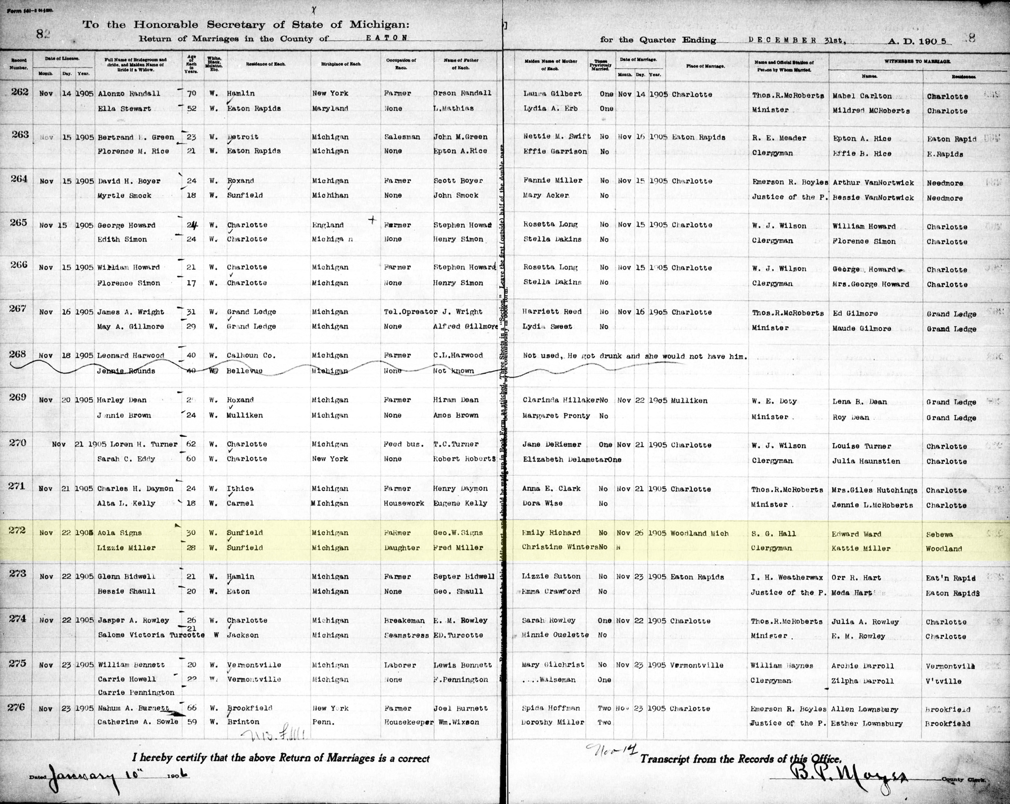 1 "Michigan Marriages, 1868-1925," database with images, FamilySearch (accessed 24 June 2021), (https://familysearch.org/ark:/61903/1:1:N3JS-54Z : 18 February 2021), Aola Signs and Lizzie Miller, 26 Nov 1905; citing Marriage, Woodland, Eaton, Michigan, Citing Secretary of State, Department of Vital Records, Lansing; FHL microfilm 4032374.