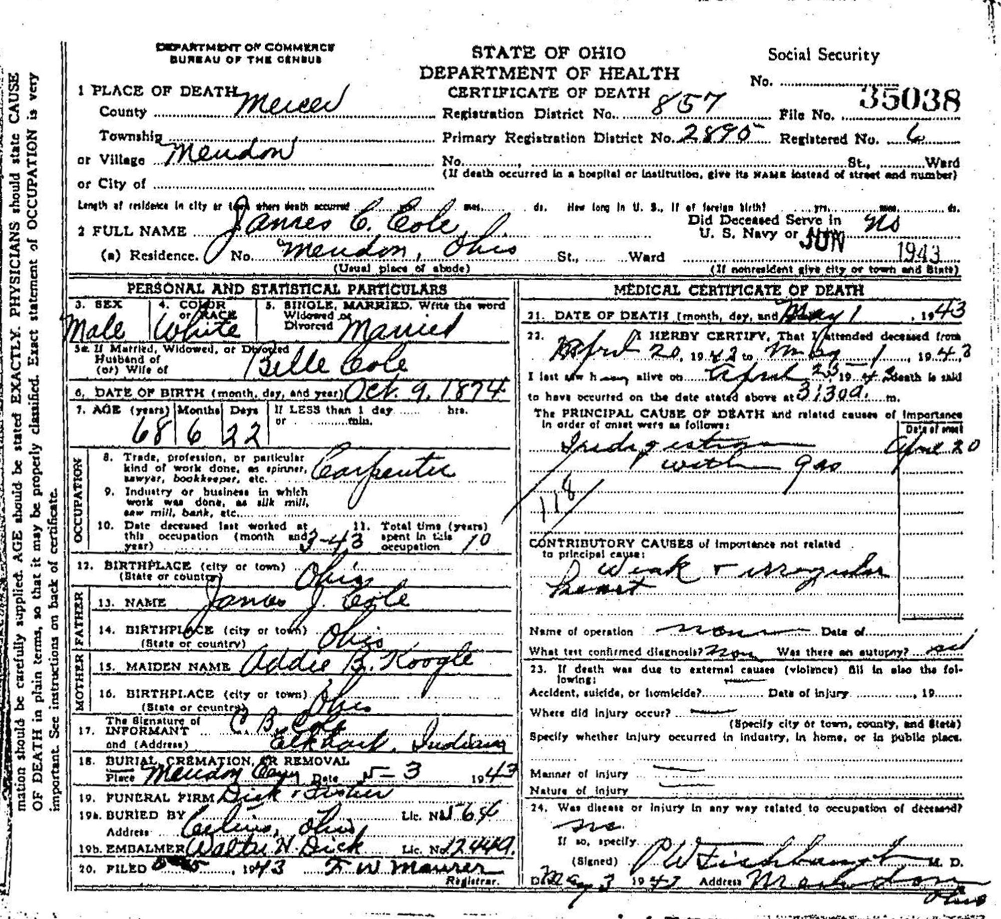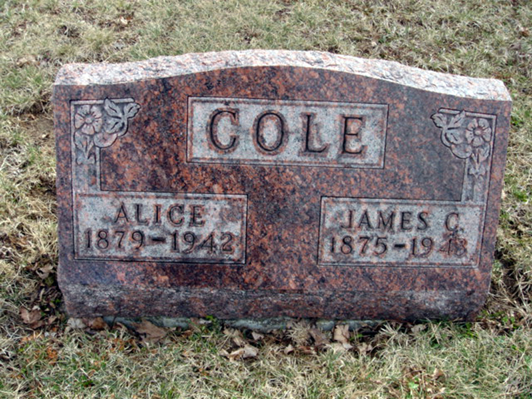 1 Find A Grave, database and images (https://www.findagrave.com/ ); accessed 05 April 2019), memorial page for James Chesney Cole (9 Oct 1875\endash 1 May 1943), Find A Grave Memorial no. 35308506, citing Mendon Cemetery, Mendon, Mercer County, Ohio, USA