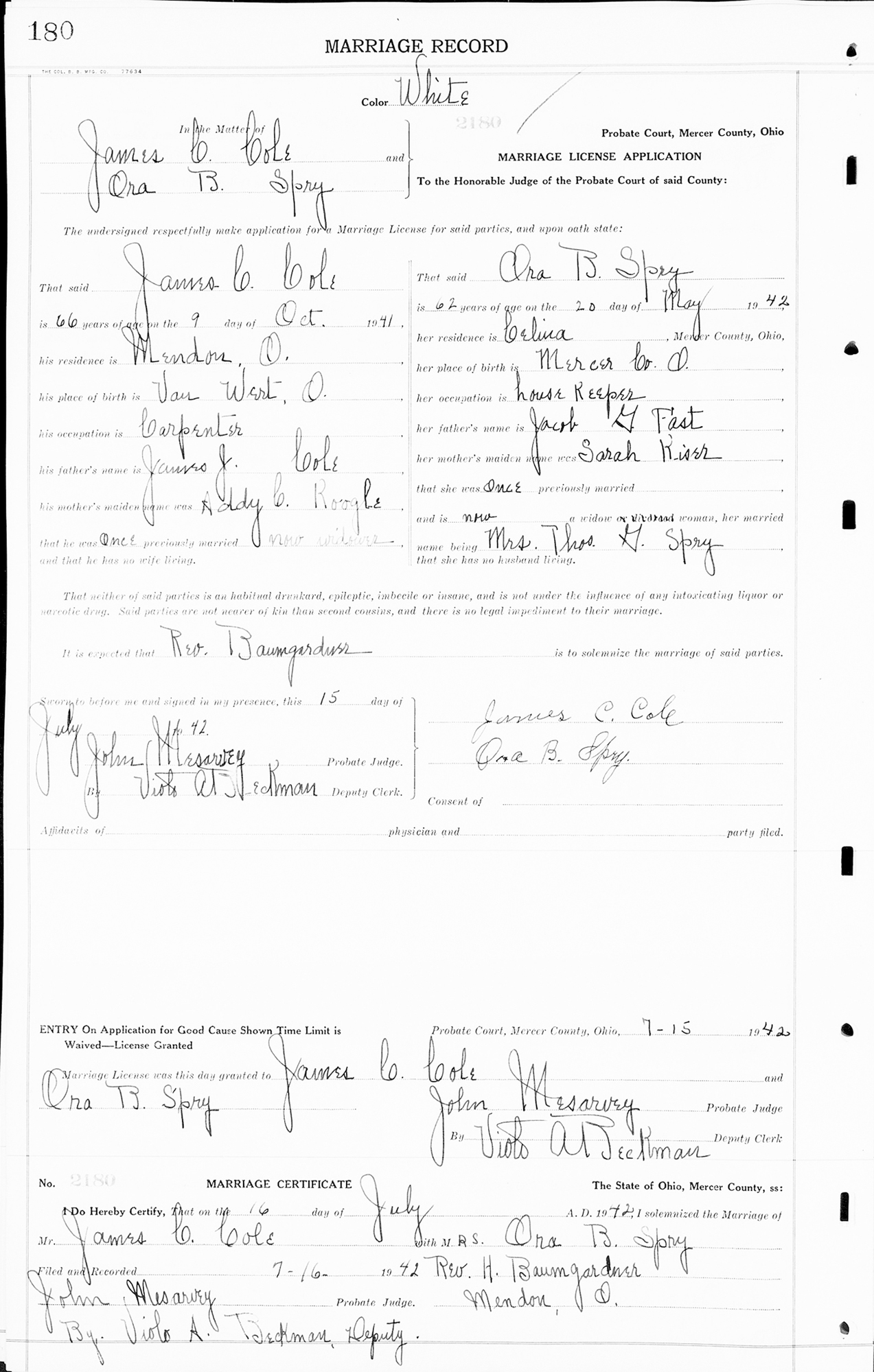 • Marriage Image: 16 July 1942, in , Mercer County, OH.
