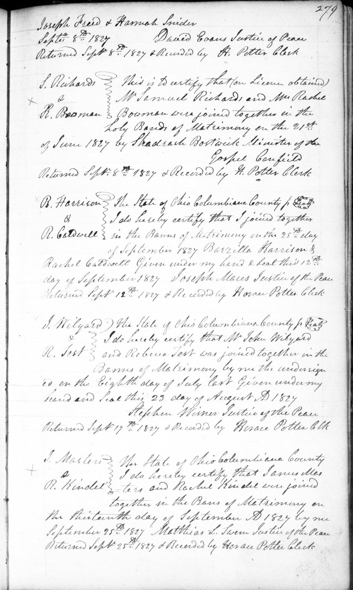 1 "Ohio, County Marriages, 1789-2016," database with images, FamilySearch.org (accessed 30 January 2015); (https://familysearch.org/ark:/61903/1:1:XDLN-386 : 8 March 2021), Samuel Richards and Rachel Bowman, 21 Jun 1827; citing Marriage, Columbiana, Ohio, United States, V 2 P 279, Franklin County Genealogical & Historical Society, Columbus; FHL microfilm.