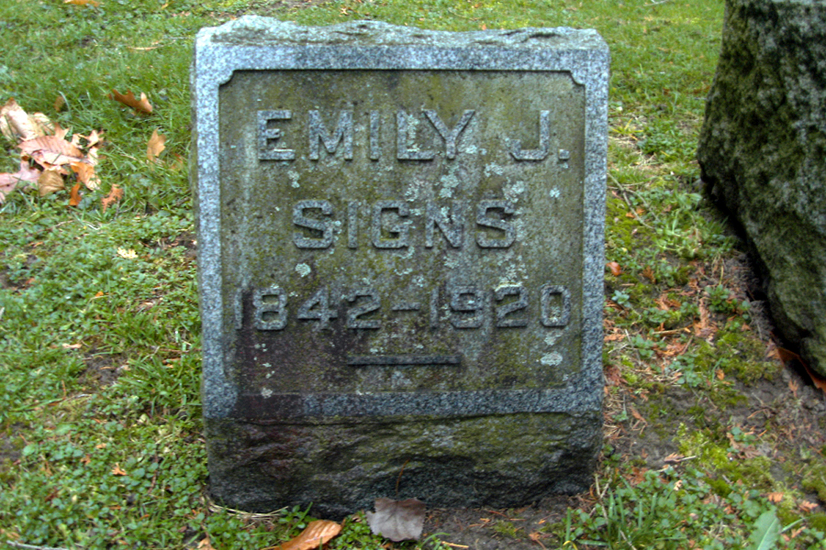 9 Find A Grave, database and images (https://www.findagrave.com/ ); accessed 22 June 2021, memorial page for Emily J Richards Signs (11 Mar 1842-26 Dec 1920), Find a Grave Memorial ID 103363532, citing Lakeside Cemetery, Lake Odessa, Ionia County, Michigan, USA