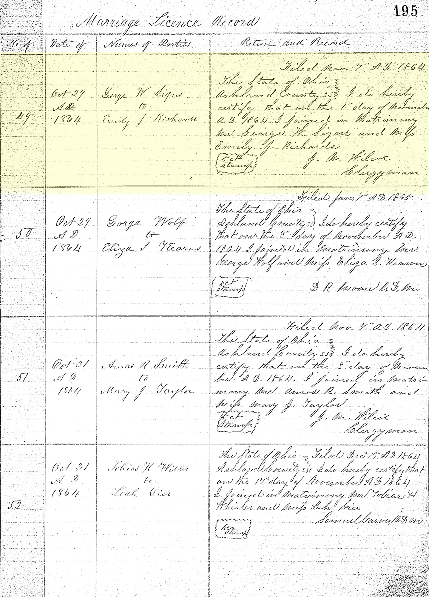 1 "Ohio, County Marriages, 1789-2016," database with images, FamilySearch.org (accessed 22 June 2021); (https://familysearch.org/ark:/61903/1:1:XZHH-9QS : 8 March 2021), George W. Signs and Emily J. Richards, 01 Nov 1864; citing Marriage, Ashland, Ohio, United States, v 3 p 195 rn 49, Franklin County Genealogical & Historical Society, Columbus; FHL microfilm.