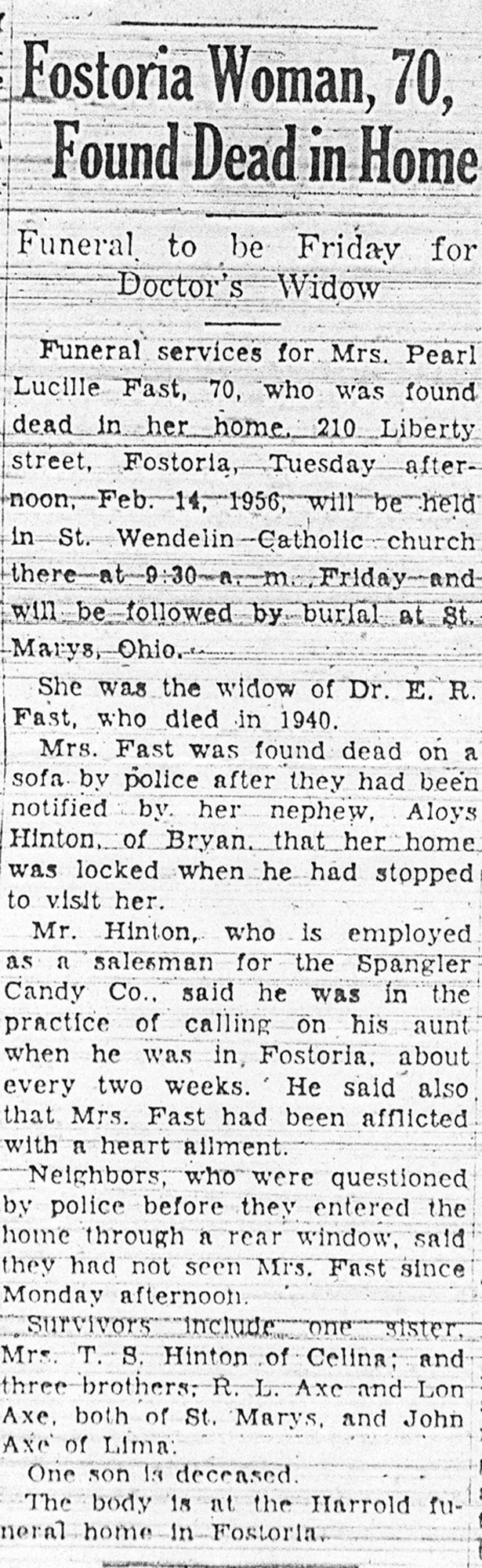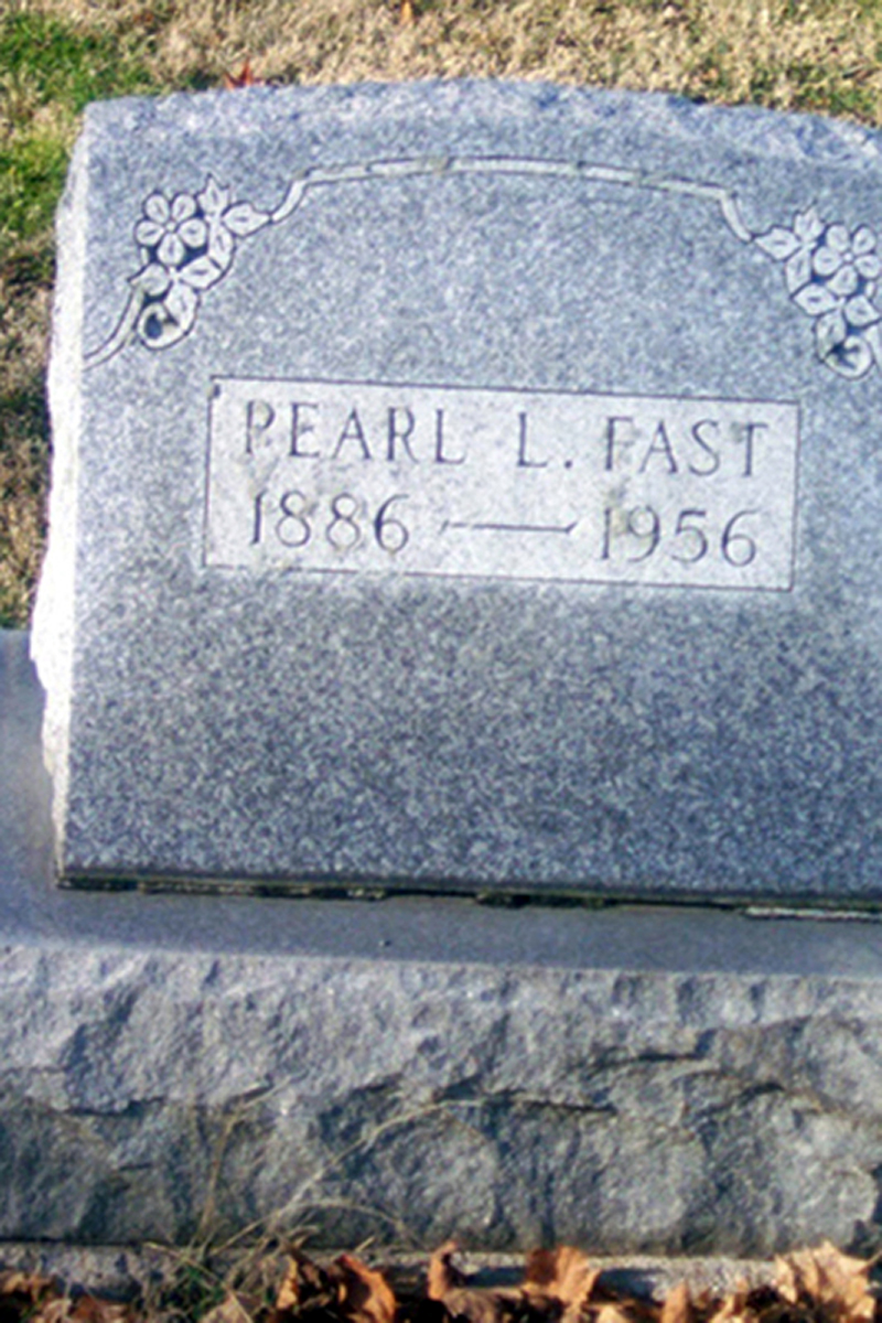 3 Find A Grave, database and images (https://www.findagrave.com/ ); accessed 15 March 2019), memorial page for Pearl Lucille Axe Fast (20 Jan 1886\endash 12 Feb 1956), Find A Grave Memorial no. 10150086, citing Elm Grove Cemetery, Saint Marys, Auglaize County, Ohio, USA