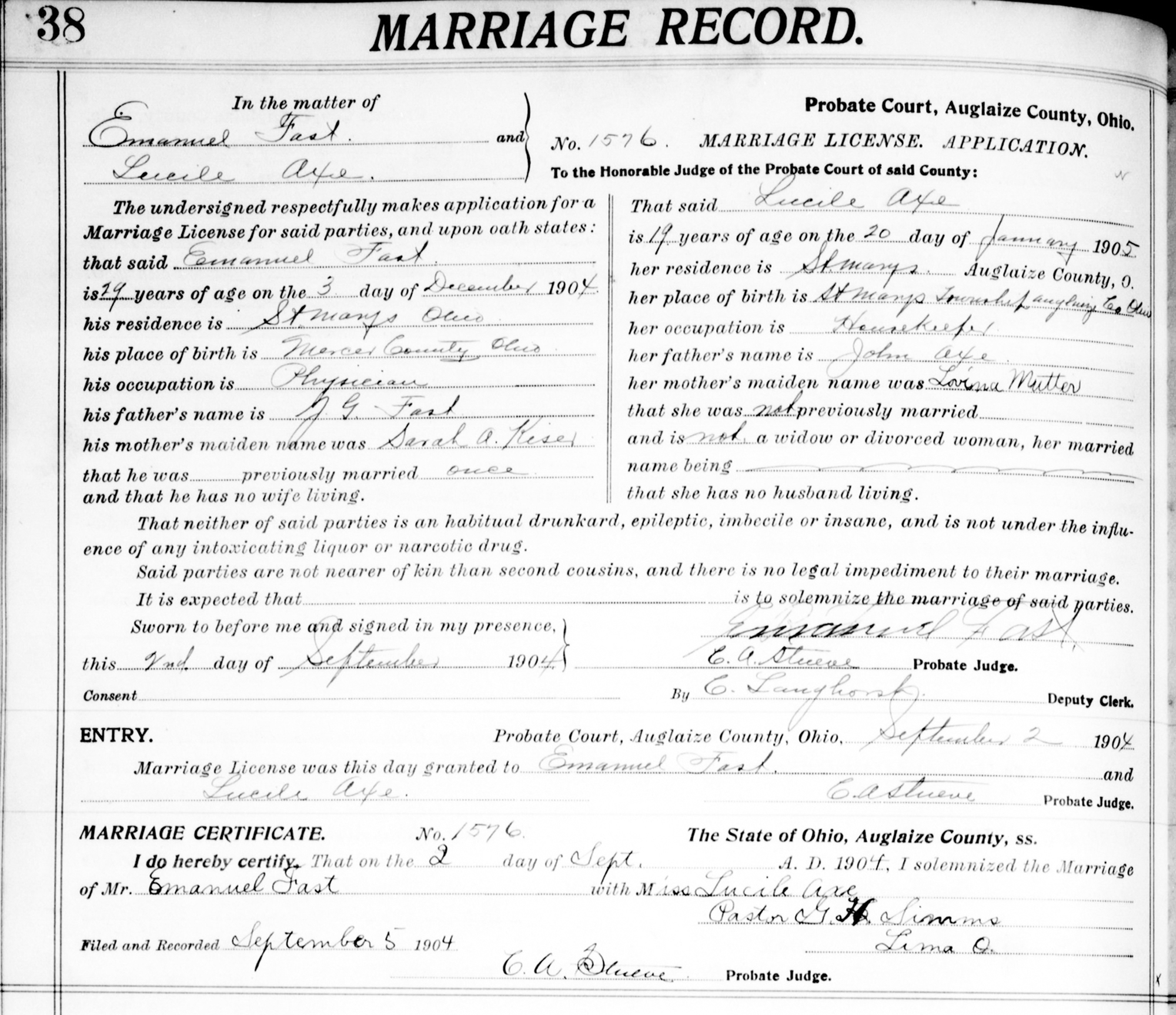 • Marriage Image: Image, on 2 September 1904, in Auglaize County, OH.