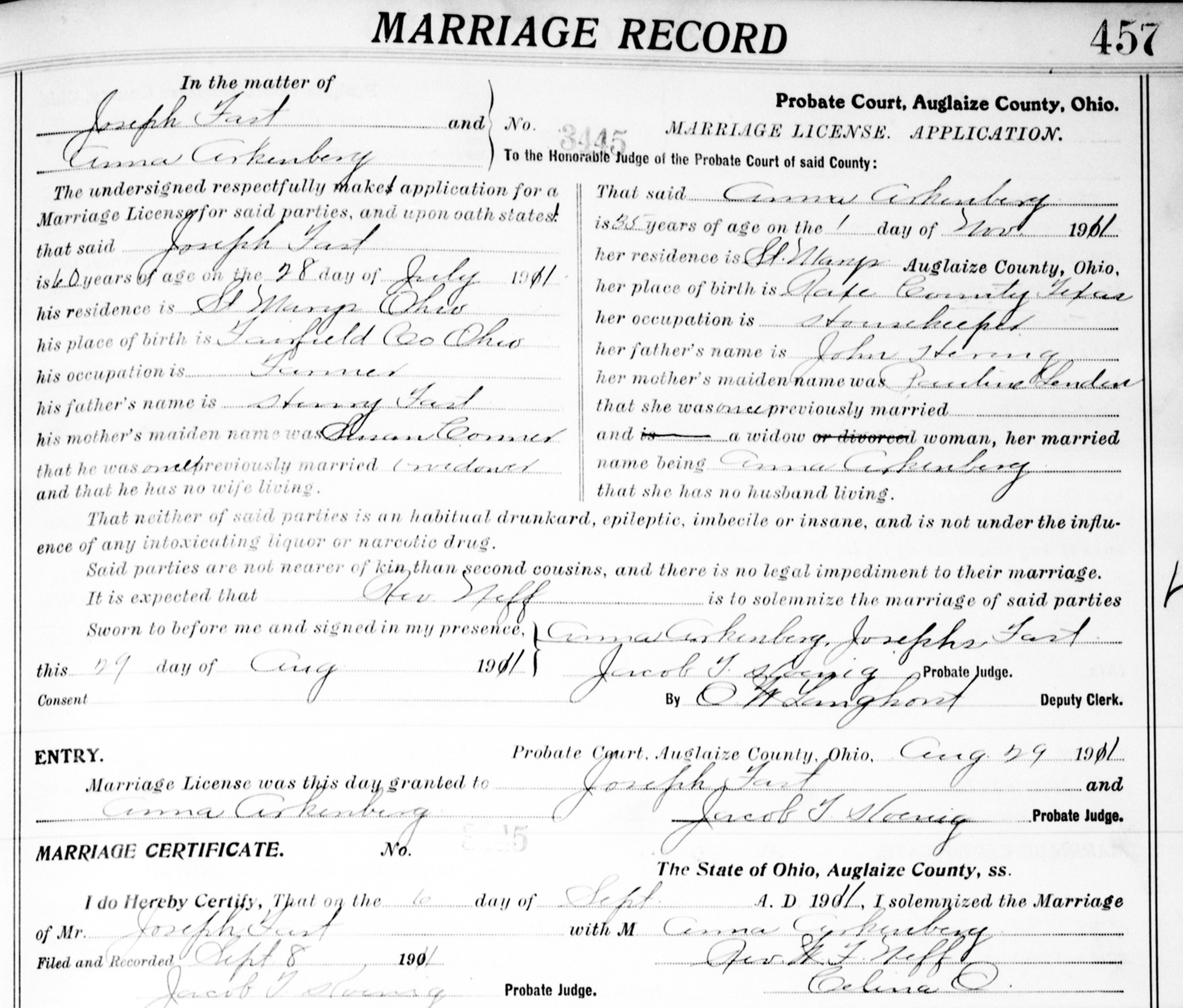 1 "Ohio, County Marriages, 1789-2016," database with images, FamilySearch.org (accessed 19 Dec 2019); Joseph Fast and Anna Arkenberg, 06 Sep 1911; citing Marriage, Auglaize, Ohio, United States, 3445, Franklin County Genealogical & Historical Society, Columbus; FHL microfilm.