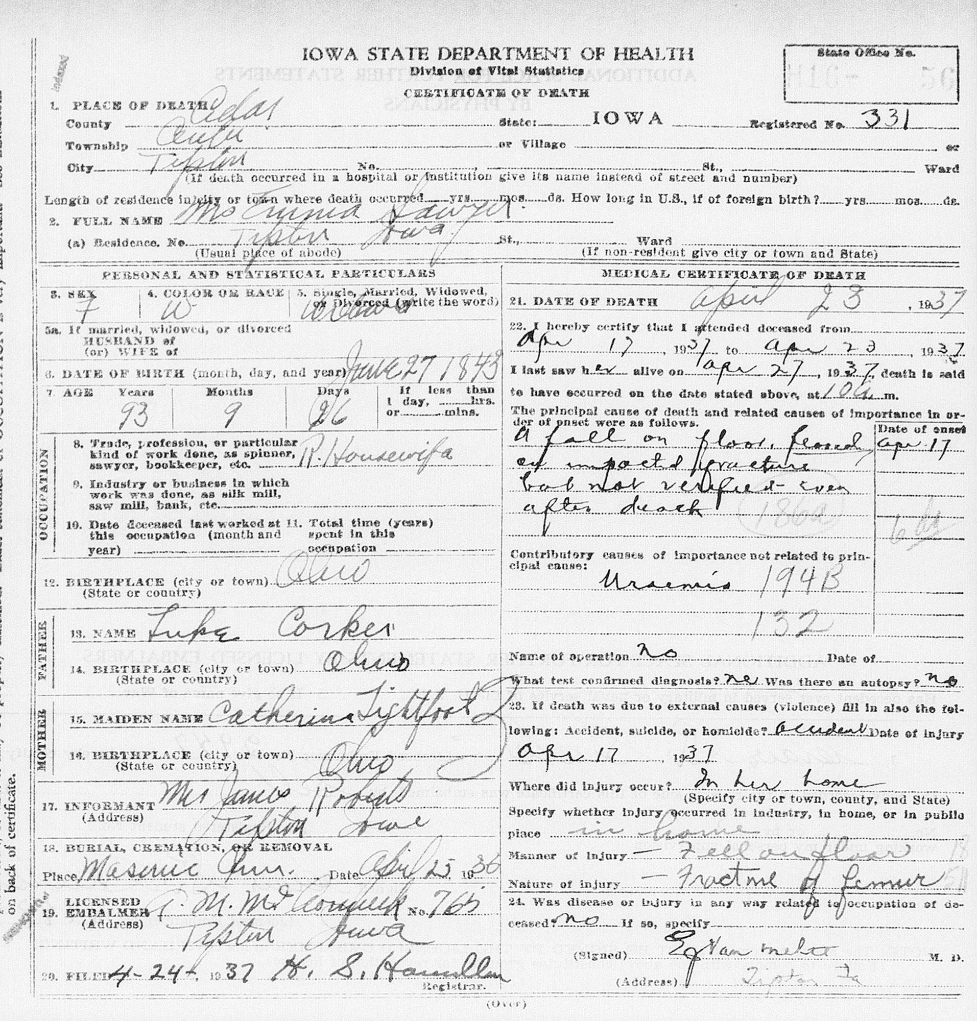 • Death Image: Image, on 23 April 1937, in Tipton, IA.