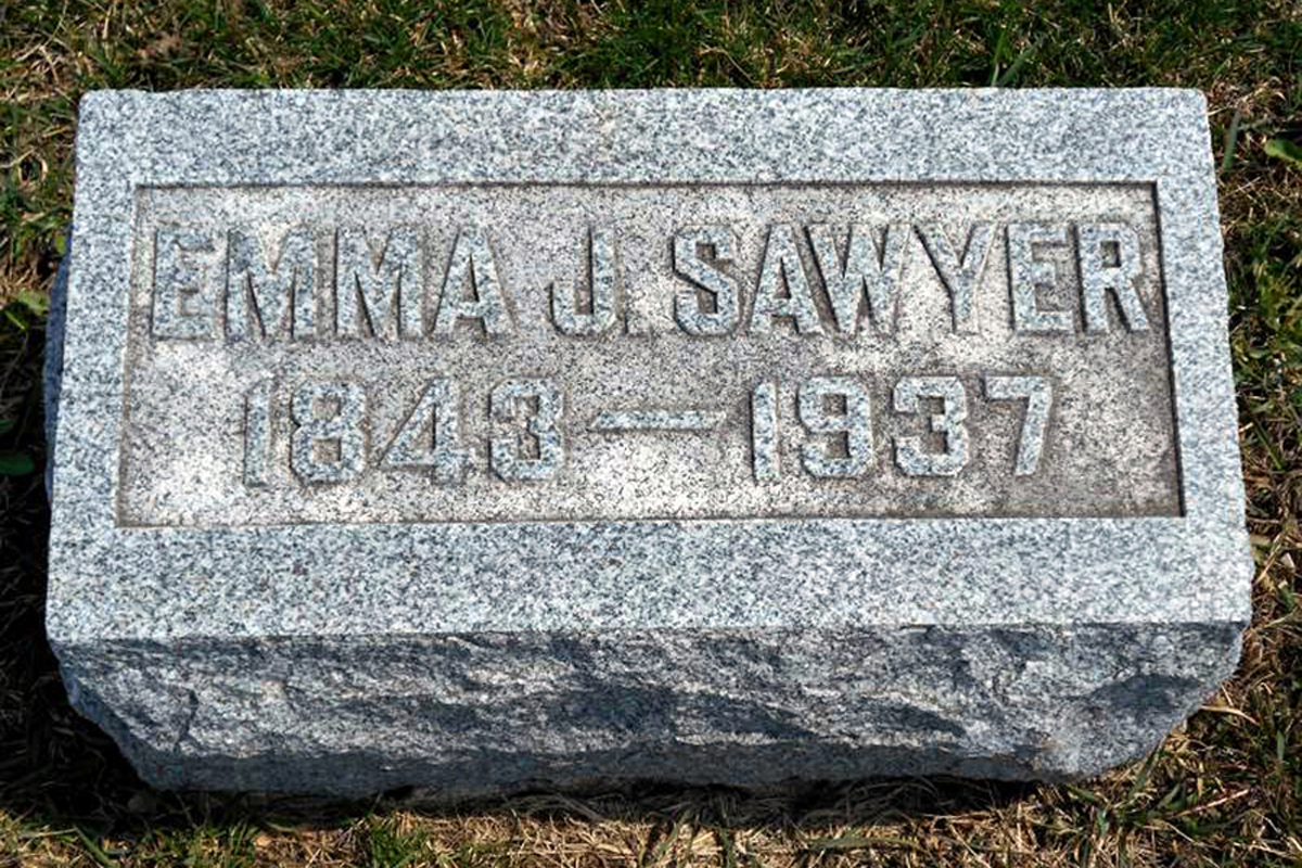 • She was buried on 25 April 1937 in the Masonic Cemetery in Tipton, IA. Emma married Andrew J. Sawyer, son of Amasa Sawyer and Elizabeth Fryberger, on 12 June 1862.1 2 3 4 (Andrew J. Sawyer was born on 8 April 1839 in , Warren County, OH,3 4 12 died on 13 December 1916 in Marshalltown, IA 12 and was buried after 13 December 1916 in Masonic Cemetery, Tipton, IA 12.). The cause of his death was Cerebral Hemorrhage.