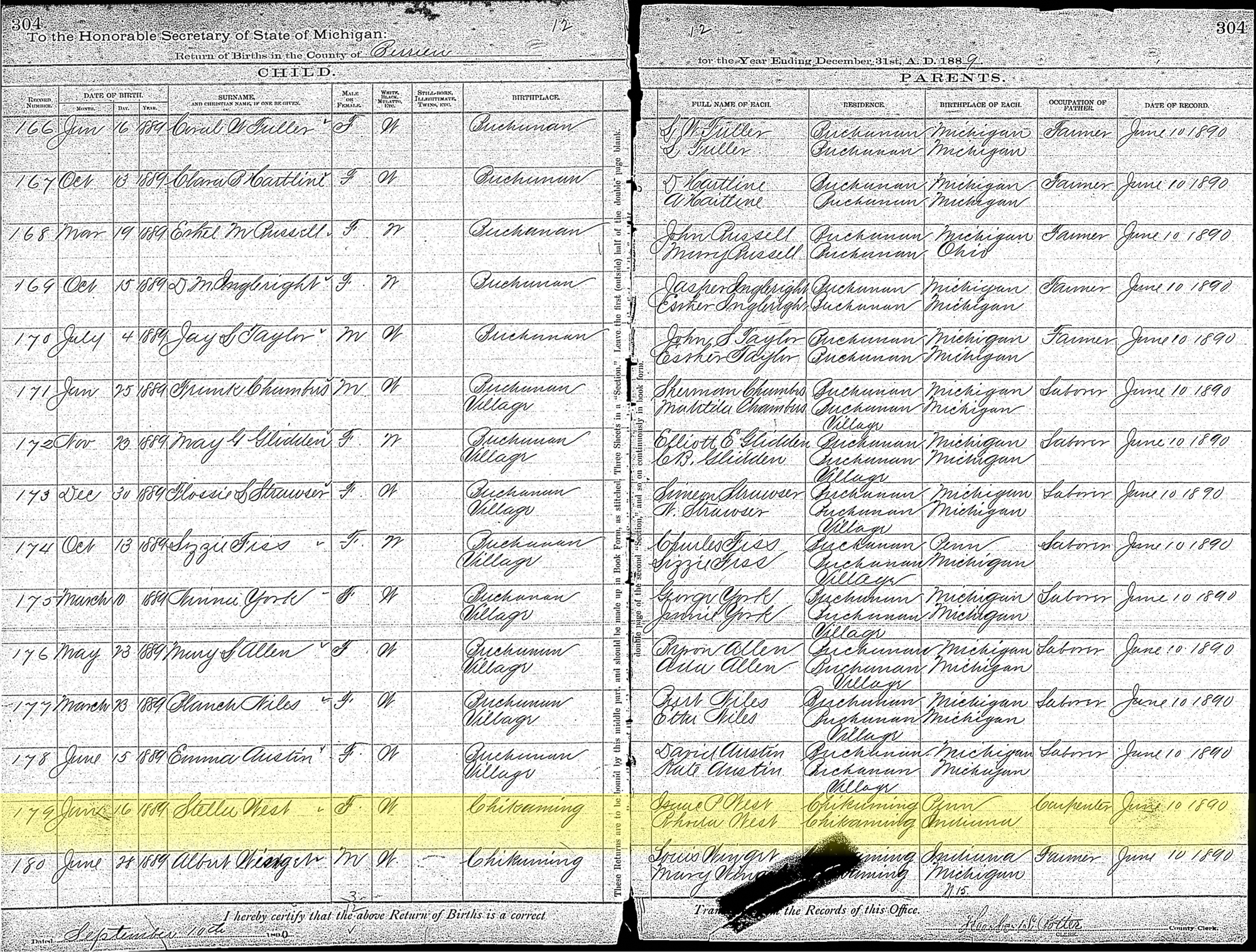 4 "Michigan Births, 1867-1902," database with images, FamilySearch.org (accessed 17 Feb 2020); Stella West, 16 Jun 1889; citing item 2 p 304 rn 179, Buchanan Village, Berrien, Michigan, Department of Vital Records, Lansing; FHL microfilm 2,321,098.