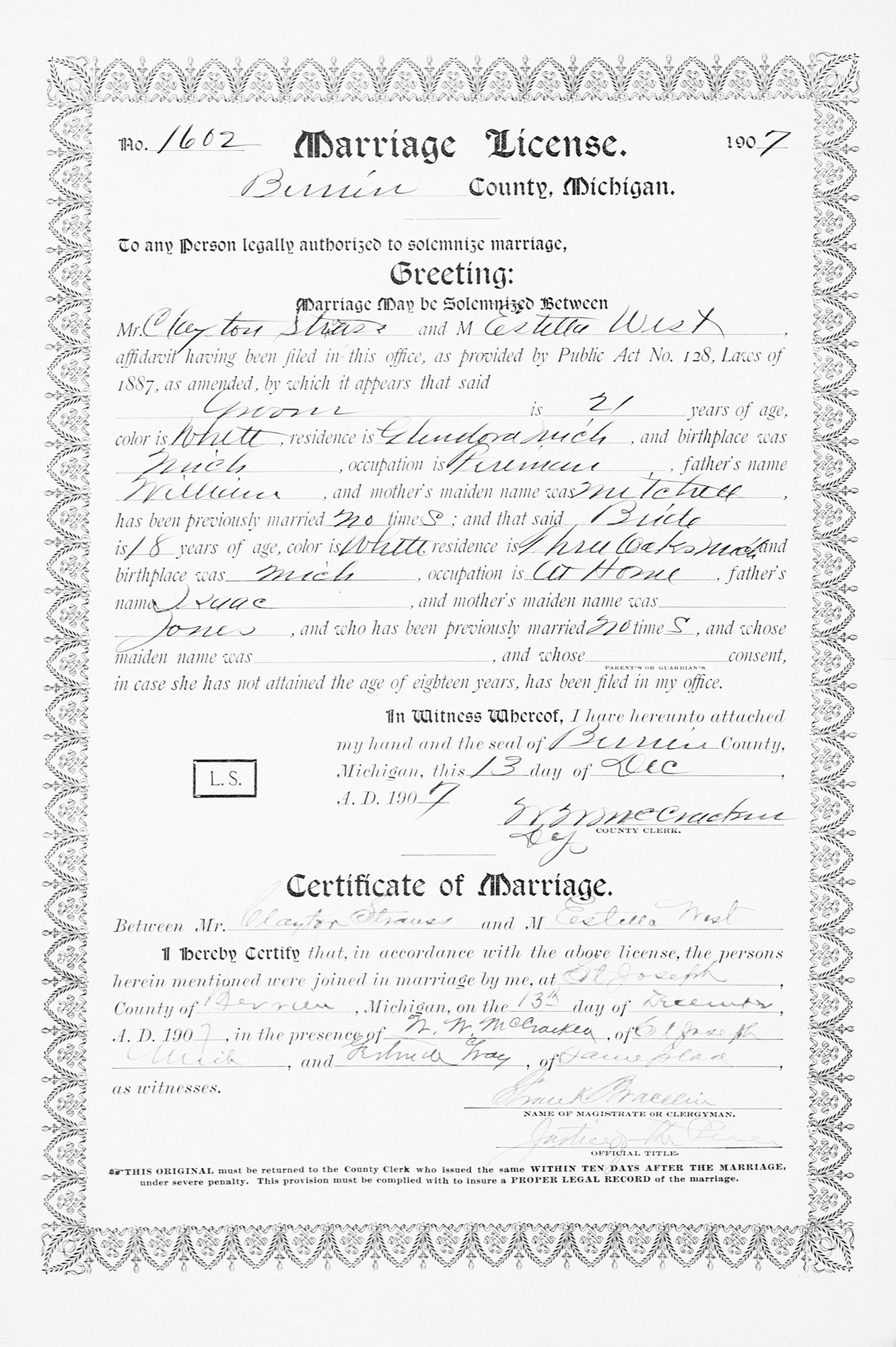 1 "Michigan Marriages, 1868-1925," database with images, FamilySearch (accessed 17 January 2021), (https://www.familysearch.org/ark:/61903/1:1:N3JP-RZV : 17 January 2021), Clayton Strauss and Estella West, 13 Dec 1907; citing Marriage, St Joseph, Berrien, Michigan, Citing Secretary of State, Department of Vital Records, Lansing; FHL microfilm 4208700.