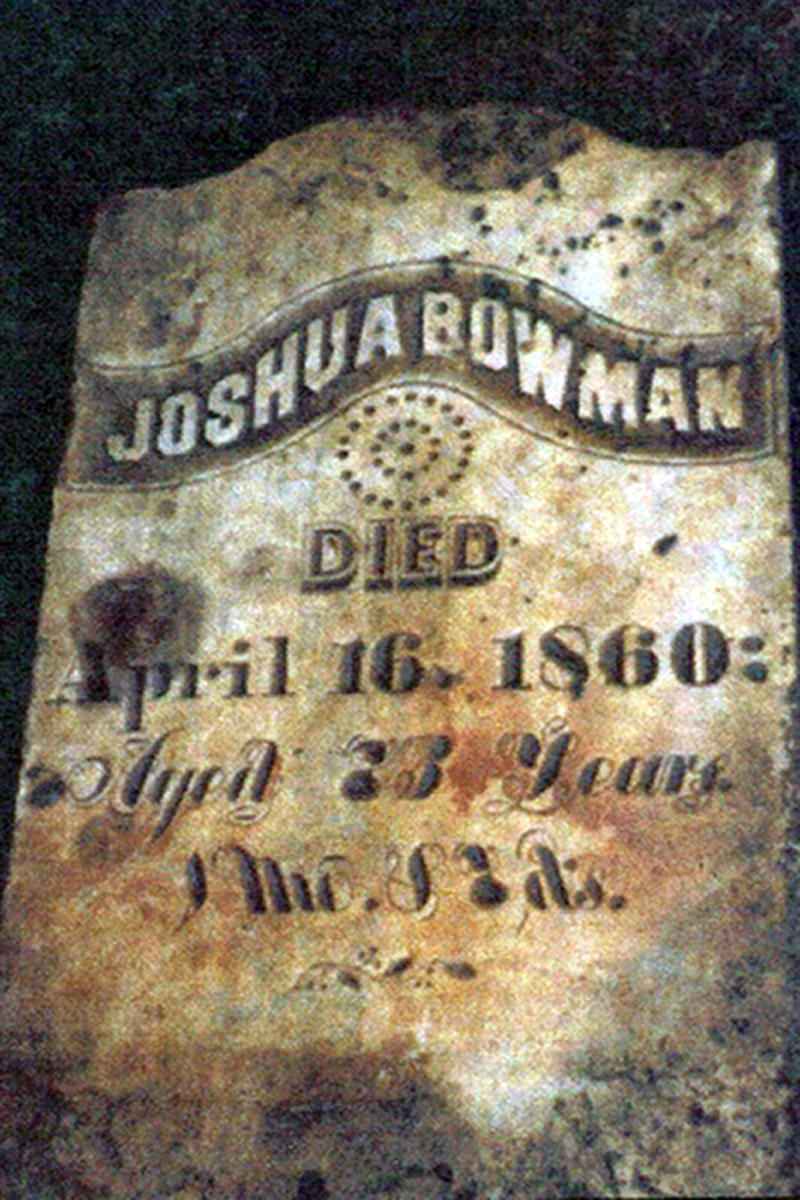 A death date of 16 Apr 1860 would certainly seem to be incorrect given that his name appeared on the 1860 census as of 1 June 1860. Apparently this date of 16 Apr 1860 comes from a widely circulated photograph of a gravestone for Joshua Bowman which gives that date. However, a close look at the photo reveals that his age, which should have been about 73 years, more closely resembles 83 years or perhaps even 33 years. This might suggest that the gravestone was for a different Joshua Bowman.