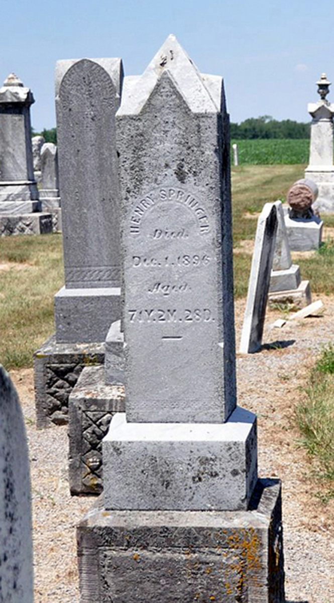Find A Grave, database and images (https://www.findagrave.com/ ); (accessed 15 December 2019), memorial page for Henry Springer, Jr (3 Sep 1825-1 Dec 1896), Find A Grave Memorial no. 39977875, citing Wren Cemetery, Wren, Van Wert County, Ohio, USA