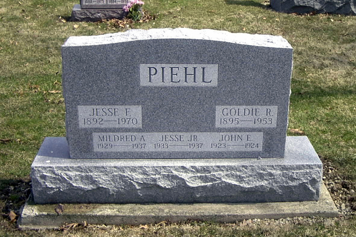 The inscription reads "PIEHL - Jesse F. 1892 - 1970; Golda R. 1895 - 1953". Along the bottom edge it reads "Mildred A. 1929 - 1937; Jesse Jr. 1933 - 1937; John E. 1923 - 1924". Plot: Ward 1, Row 8.