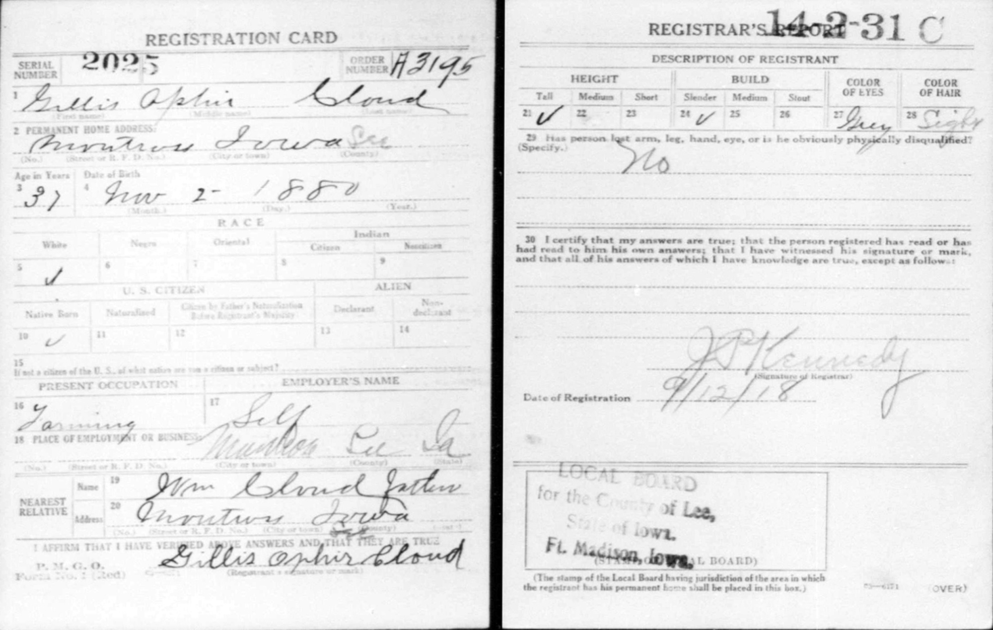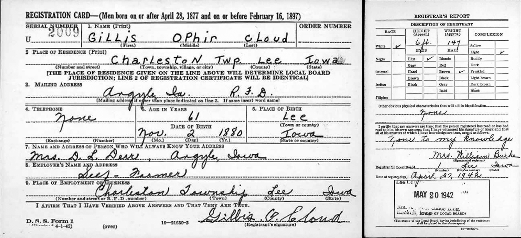 • Gillis Ophir Cloud registered for WW II Draft: 27 April 1942, Charleston, IA. |