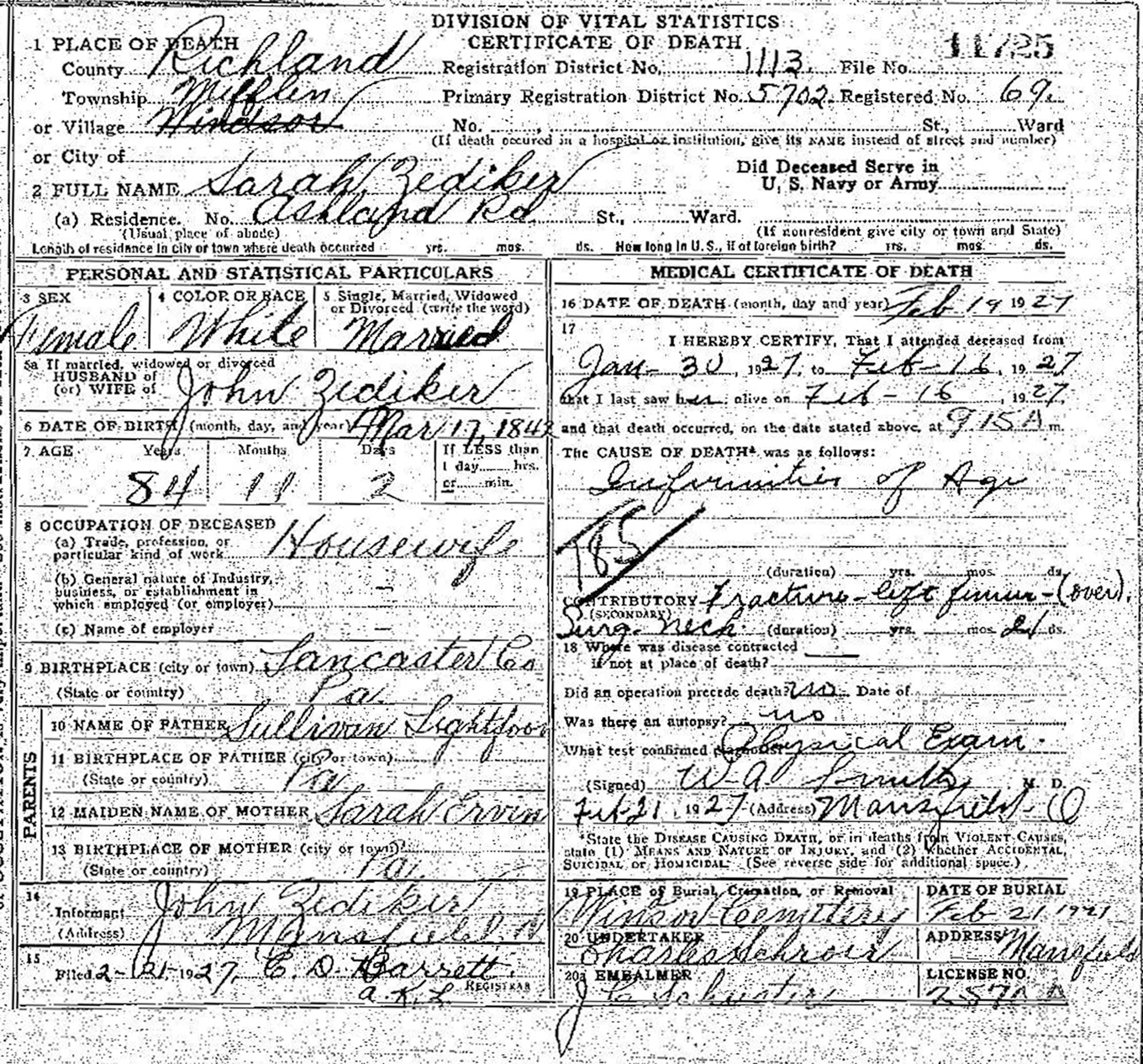 13 "Ohio Deaths, 1908-1953," database with images, FamilySearch.org (accessed 6 Nov 2013), Name: Sarah Zediker; Event Date: 19 Feb 1927; Event Place: Millen, Richland, Ohio.