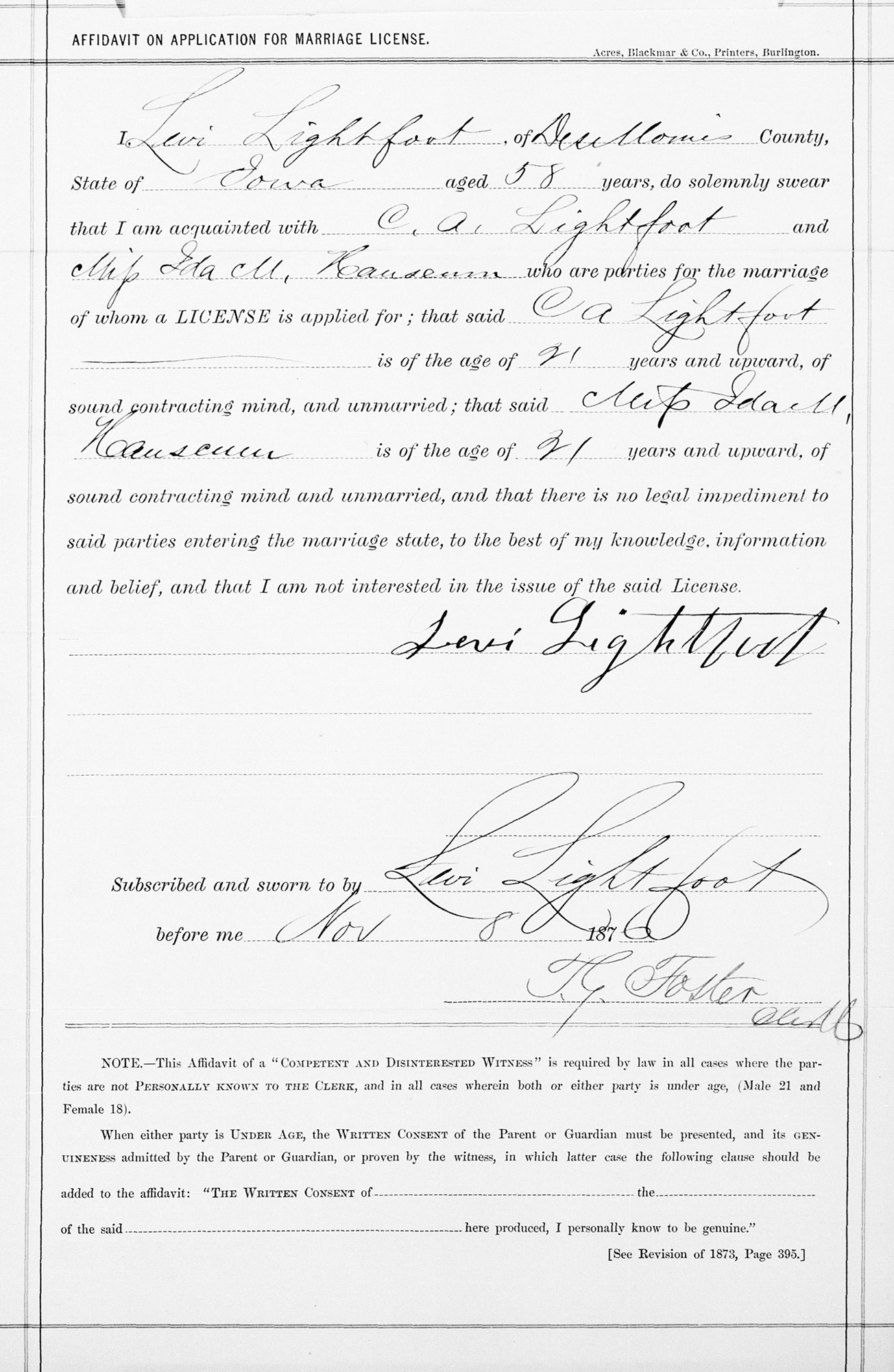 2 "Iowa, County Marriages, 1838-1934," database, FamilySearch (https://familysearch.org/search/collection/1805551 : accessed 19 Jul 2020), C. A. Lightfoot and Ida M. Hauscum, 08 Nov 1876, Des Moines County, Iowa, United States; citing reference 287, county courthouses, Iowa; FHL microfilm 1,675,828.