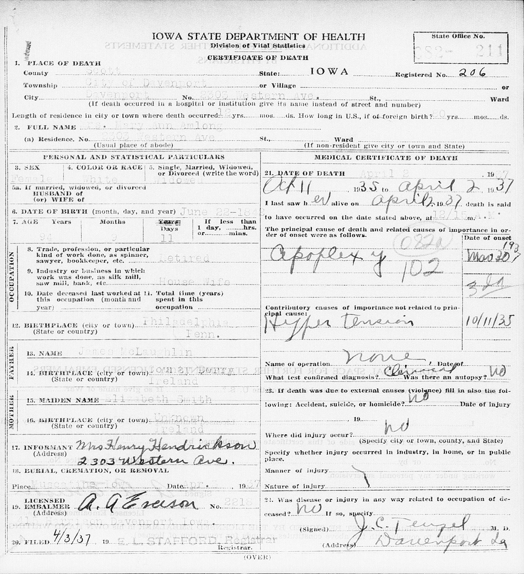 10 "Iowa, Death Records, 1904-1951," database with images, FamilySearch (https://www.familysearch.org/search/collection/2531337 : accessed 26 Sep 2019), Mary Ann Amlong, 02 Apr 1937, Davenport, Scott, Iowa, United States; citing certificate #82211, State Historical Society of Iowa, Des Moines; FamilySearch digital folder 101821068.