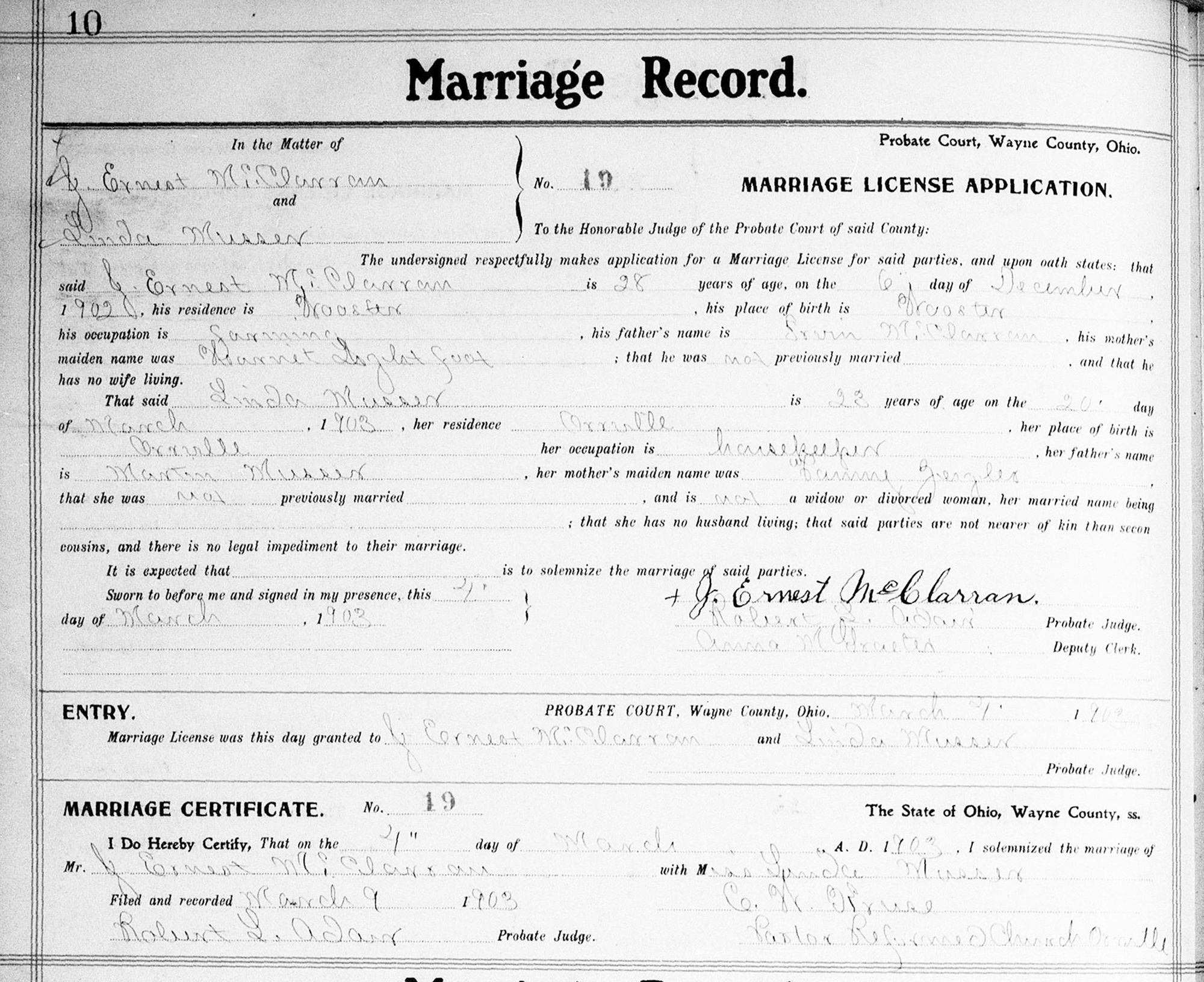 • Marriage Image: 4 March 1903, in , Wayne County, OH. • They appeared on the 1910 US Census in Wooster Township, Wayne County, OH on 18 April 1910. 1 • They appeared on the 1920 US Census in Wooster, Wayne, Ohio, United States on 9 January 1920. 2