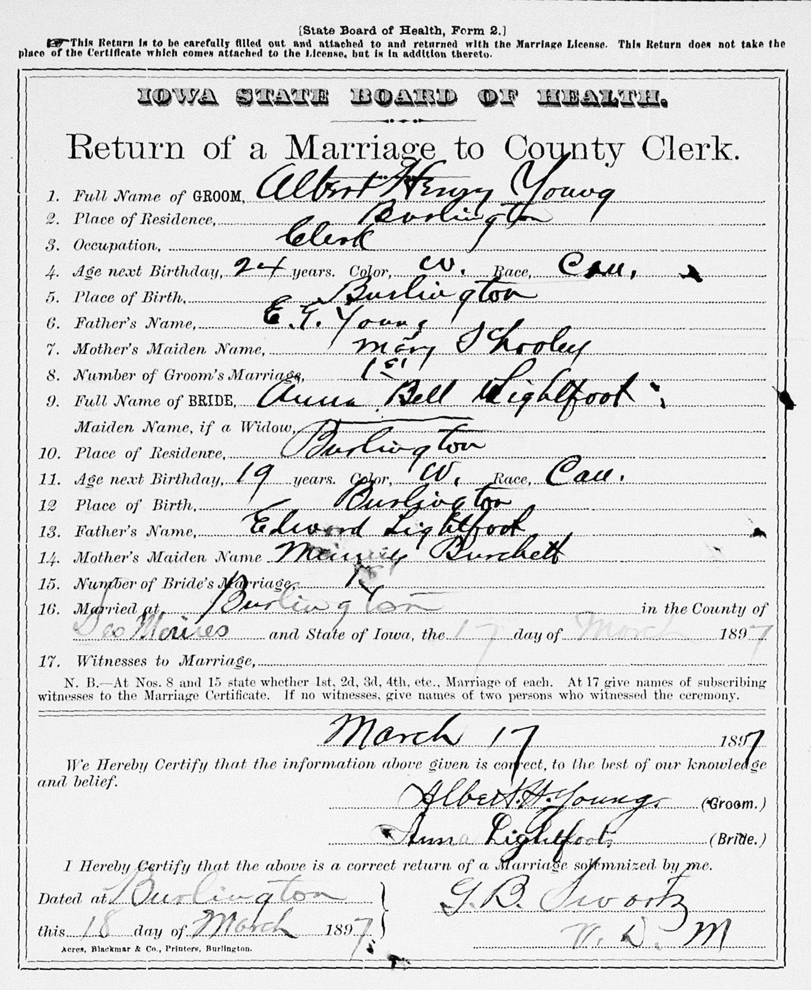 1 "Iowa, County Marriages, 1838-1934," database, FamilySearch (https://familysearch.org/search/collection/1805551 : accessed 15 Oct 2013), Albert Henry Young and Anna Bell Lightfoot, 17 Mar 1897, Des Moines, Iowa, United States; citing reference, county courthouses, Iowa; FHL microfilm 1,683,031.
