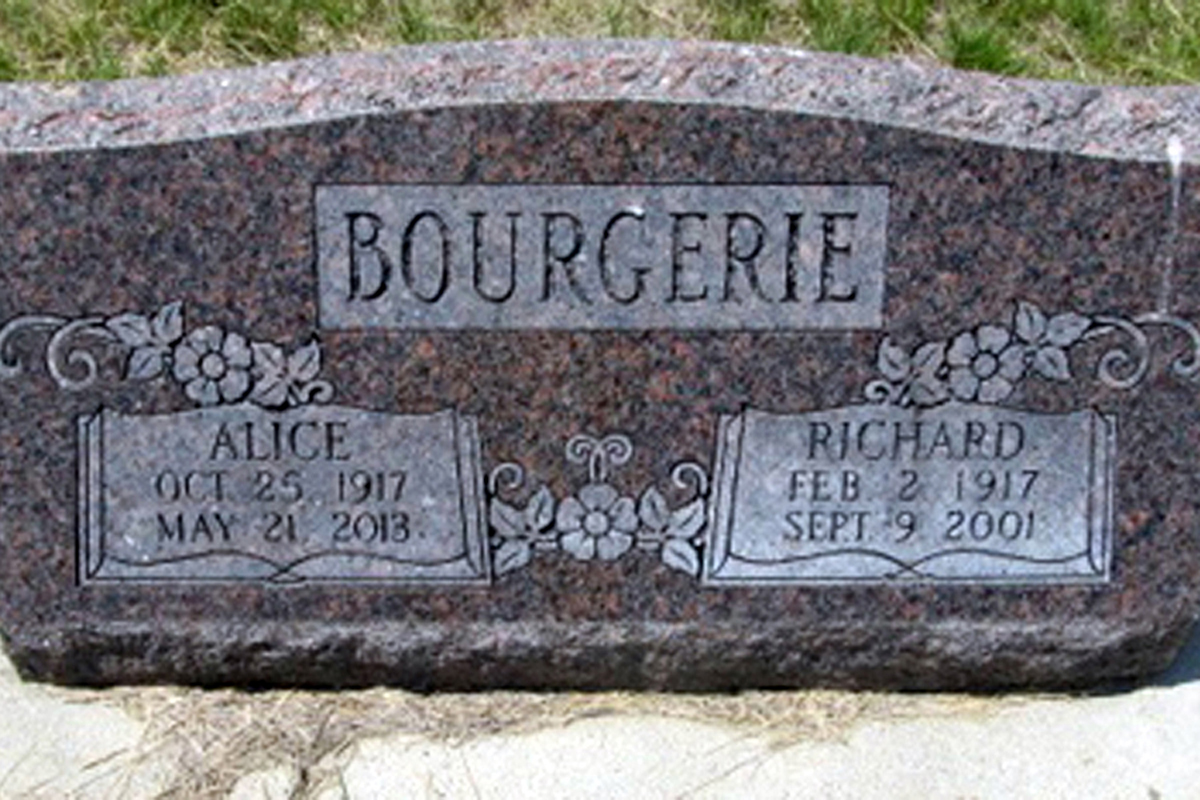 • She was buried on 25 May 2013 in the Bethlehem Cemetery in Pine River, MN. • Her obituary was published in the Star Tribune on 25 May 2013 in Minneapolis, MN. • She signed a will on 9 September 2013 in Wadena, MN. Alice married Richard Hector Bourgerie, son of Janeor Chester Bourgerie and Nellie Isabelle Patterson, about 1936.1 2 (Richard Hector Bourgerie was born on 2 February 1917 in Minnesota,1 2 7 died on 9 September 2001 in Brainerd, MN 2 7 and was buried on 13 September 2001 in Pine River, MN 2.)