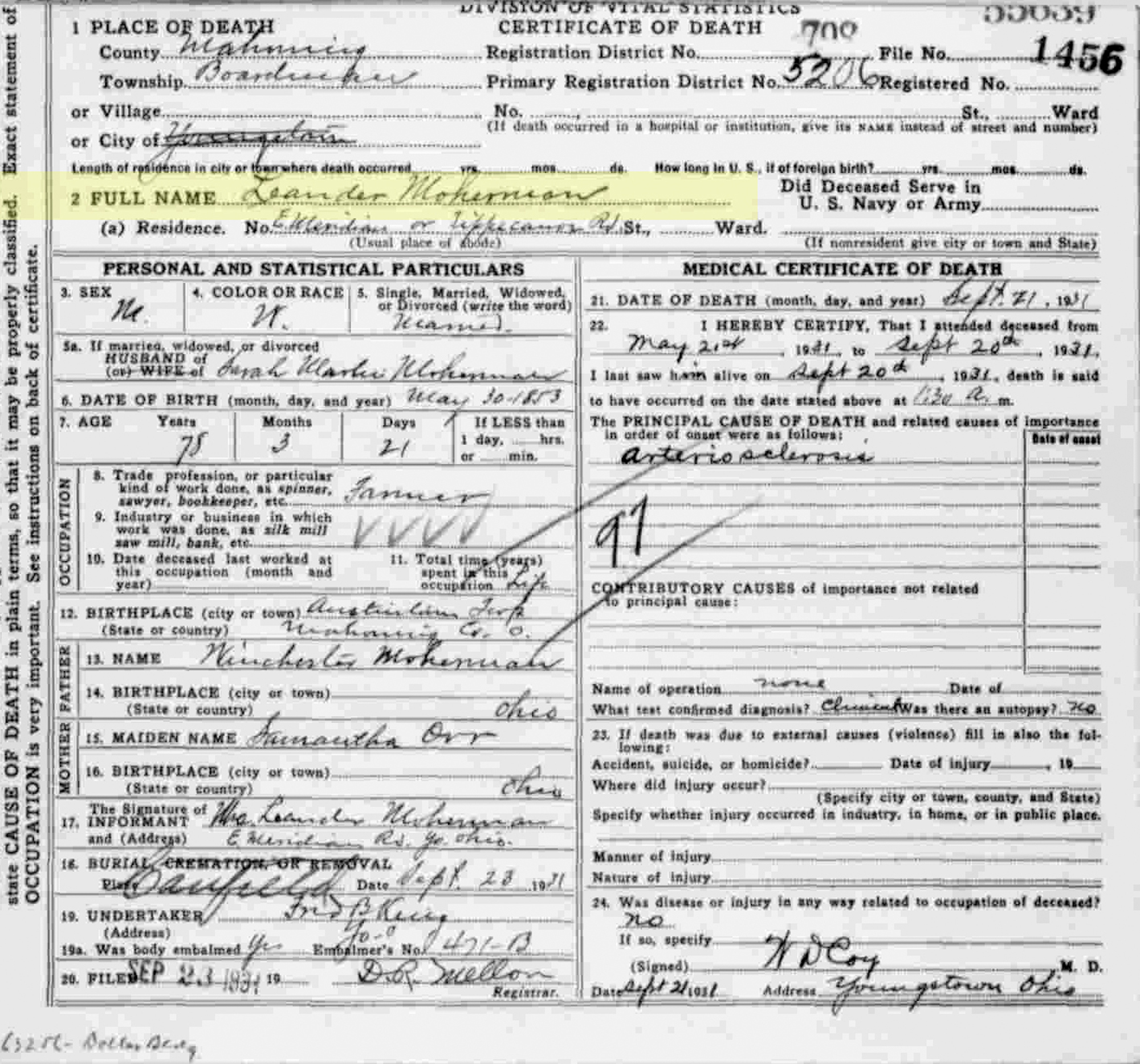 9 "Ohio Deaths, 1908-1953," database with images, FamilySearch.org (accessed 7 April 2021), (https://www.familysearch.org/ark:/61903/1:1:X6MW-RJS : 6 April 2021), Leander Moherman, 21 Sep 1931; citing Boardman Twp., Mahoning Co., Ohio, reference fn 55639; FHL microfilm 1,992,474.