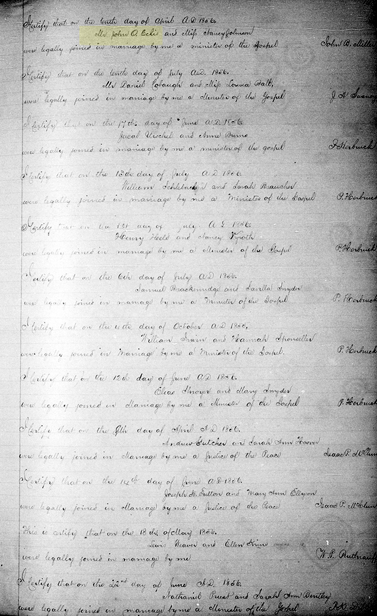 2 "Ohio, County Marriages, 1789-2016," database with images, FamilySearch.org (accessed 17 March 2021); (https://familysearch.org/ark:/61903/1:1:XDPY-9M9 : 8 March 2021), John O Eclio and Nancy Johnson, 10 Apr 1856; citing Marriage, Stark, Ohio, United States, p 163, Franklin County Genealogical & Historical Society, Columbus; FHL microfilm.