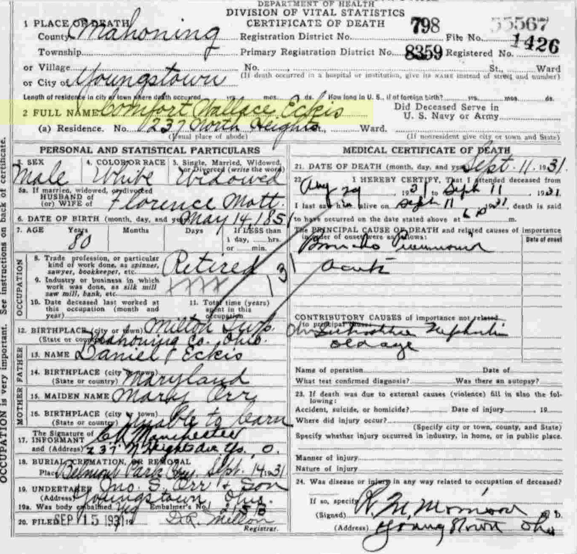 9 "Ohio Deaths, 1908-1953," database with images, FamilySearch.org (accessed 20 March 2021), (https://familysearch.org/ark:/61903/1:1:X6MW-57P : 8 March 2021), Comfort Wallace Eckis, 11 Sep 1931; citing Youngstown, Mahoning Co., Ohio, reference fn 55567; FHL microfilm 1,992,474.