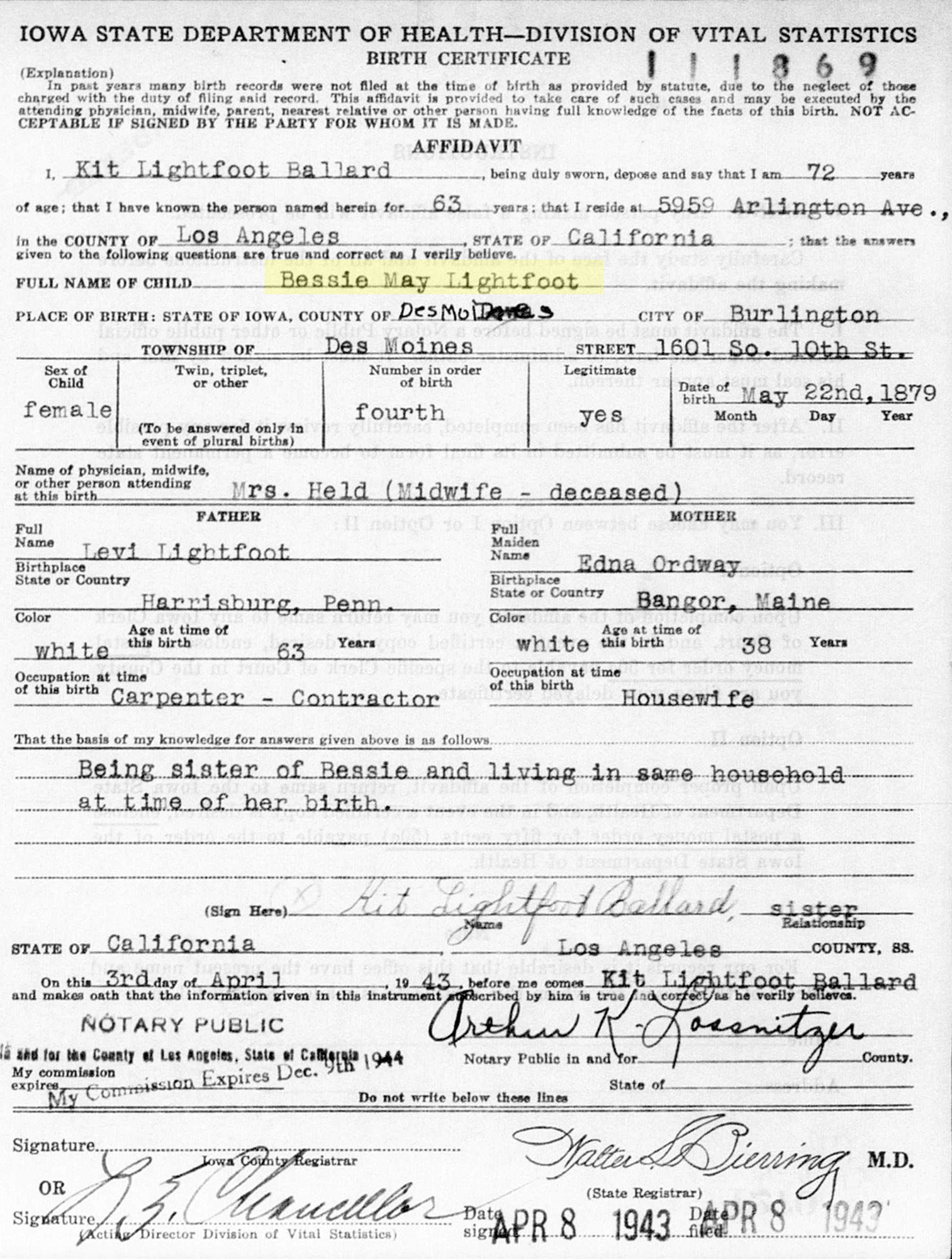 7 "Iowa, Delayed Birth Records, 1850-1939," database with images, FamilySearch (https://www.familysearch.org/search/collection/2527591 : accessed 17 Jul 2020), Bessie May Lightfoot, 22 May 1879, Burlington Township, Des Moines, Iowa, United States; citing reference ID 111869, State Historical Society of Iowa, Des Moines; FamilySearch digital folder 101713539.