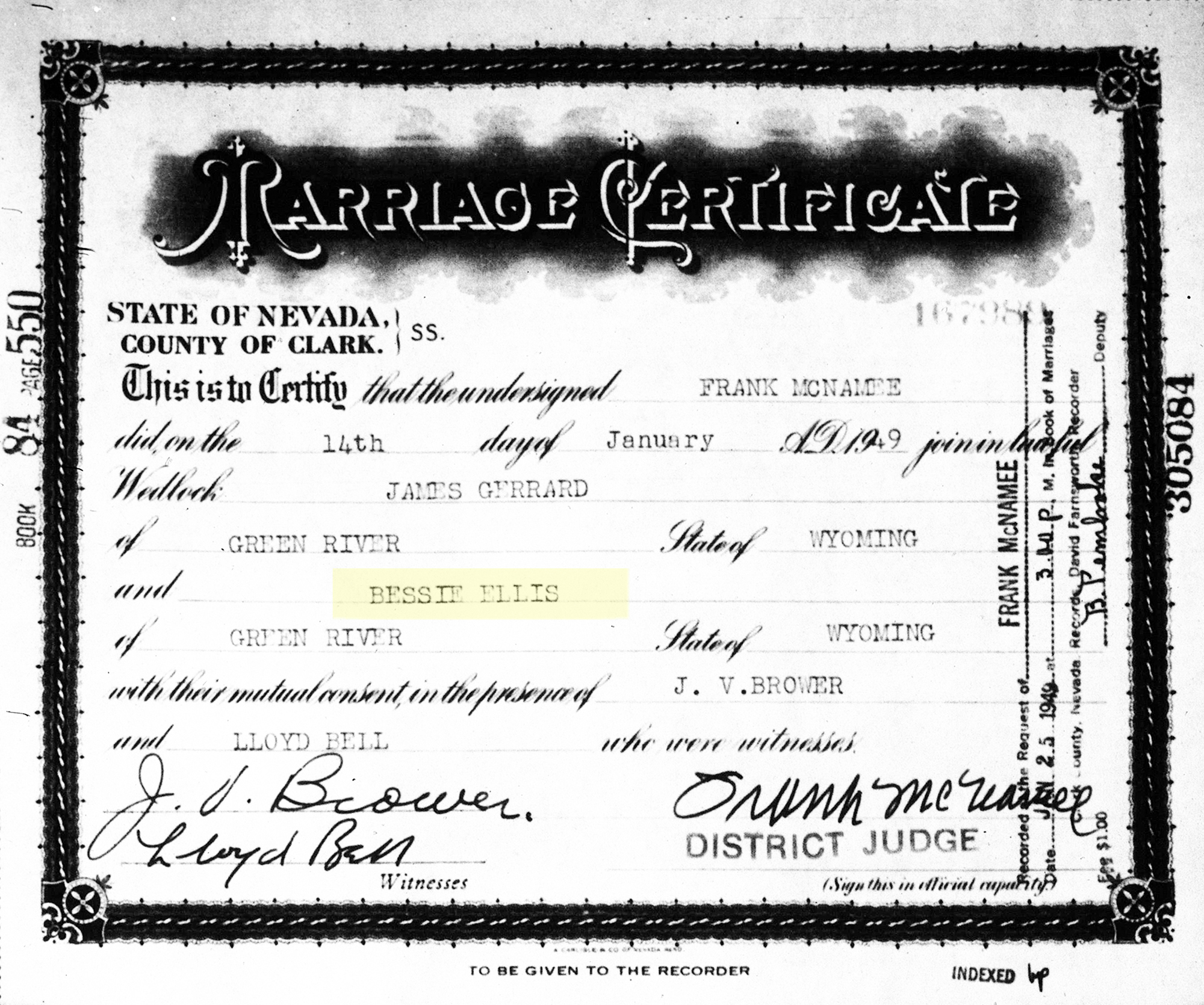 6 "Nevada County Marriages, 1862-1993," database, FamilySearch (https://www.familysearch.org/search/collection/1943751 : accessed 22 Jul 2020), James Gerrard and Bessie Ellis, 14 Jan 1949; citing Marriage, Clark, Storey, Nevada, United States, Nevada State Museum and Historical Society, Las Vegas; FHL microfilm 005247198.