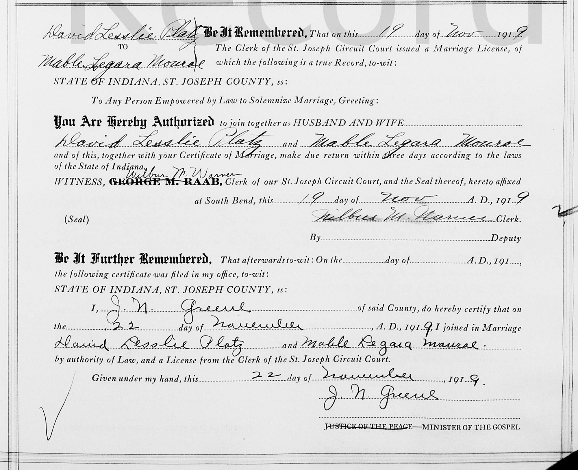 2 "Indiana Marriages, 1811-2019," database with images, FamilySearch (accessed 18 Feb 2020); David Lesslie Platz and Mable Legara Monroe, 22 Nov 1919; citing St. Joseph, Indiana, United States, Marriage Registration, Indiana Commission on Public Records, Indianapolis; FHL microfilm 005206302.
