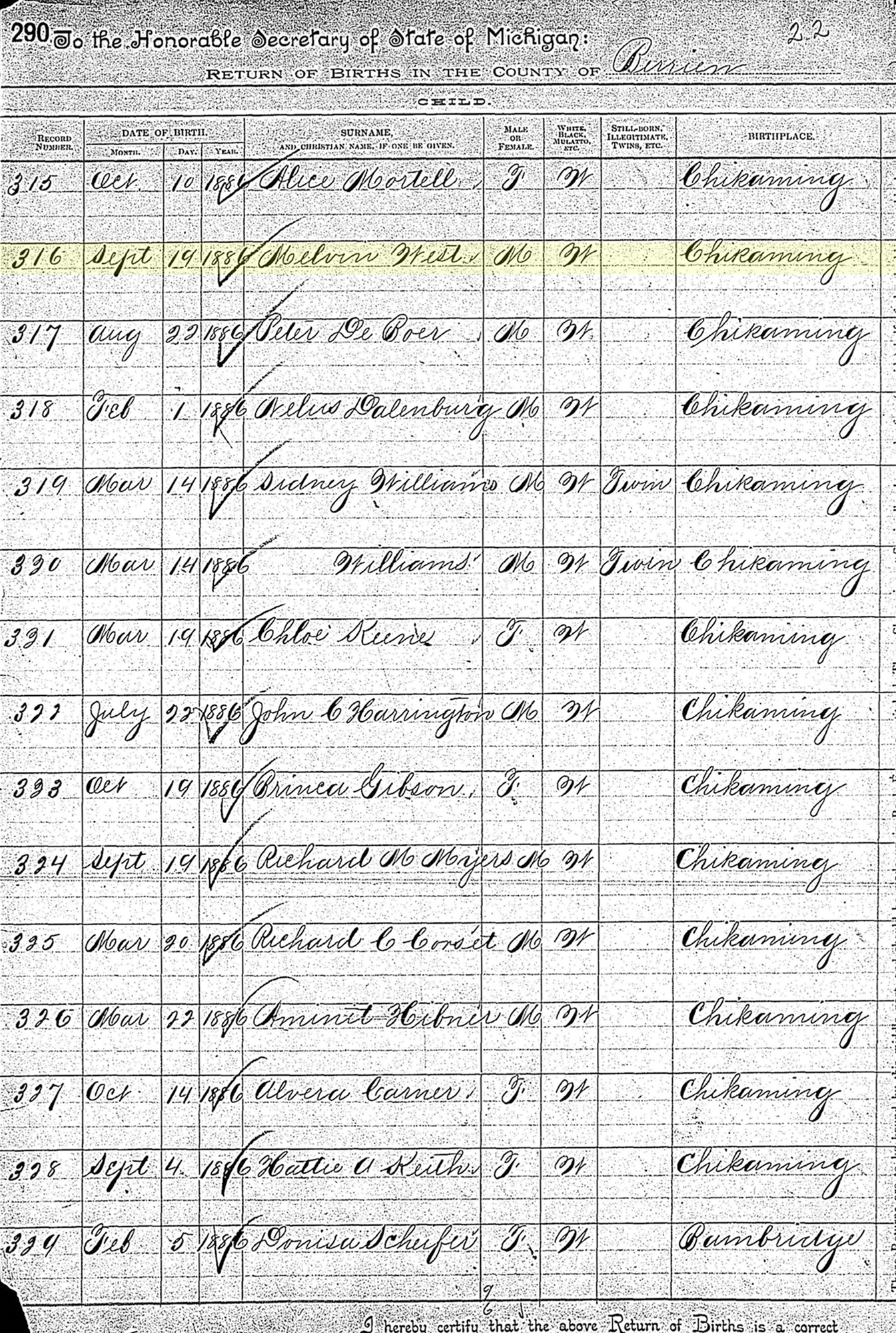 Name: Melvin West Birth Date: 19 Sep 1886 Birthplace: Chikaming Twp., Berrien, Michigan Gender: Male Father's Name: Isaac P West Father's Birthplace: Penn Mother's Name: Phoebe West Mother's Birthplace: Indiana Reference ID: item 1 p 290 rn 316