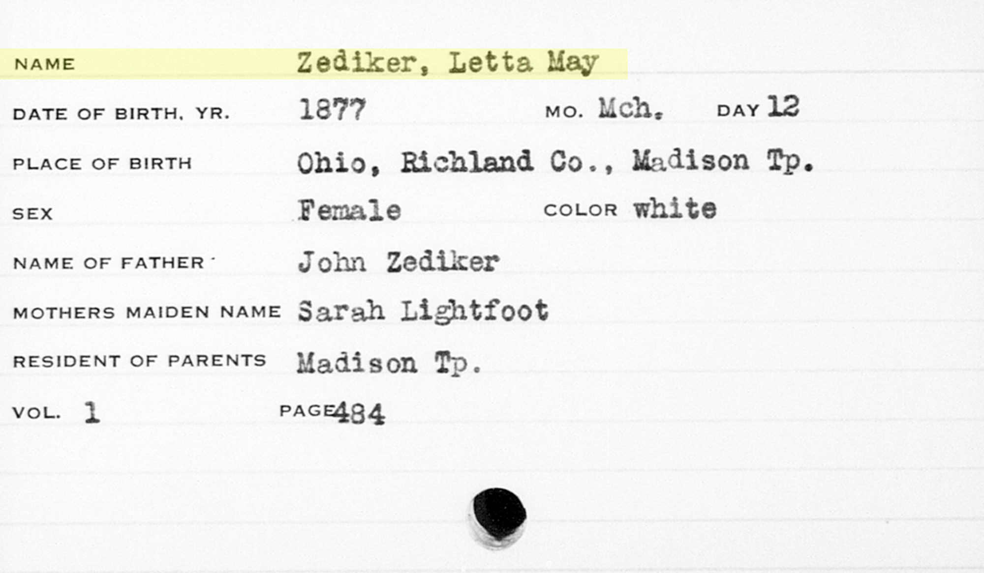 "Ohio, County Births, 1841-2003," database with images, FamilySearch (accessed 27 Nov 2019); Yetta May Zediker, 12 Mar 1877; citing Birth, Madison Tp., Richland Co., Ohio, United States, county courthouses, Ohio; FHL microfilm 541,349.
