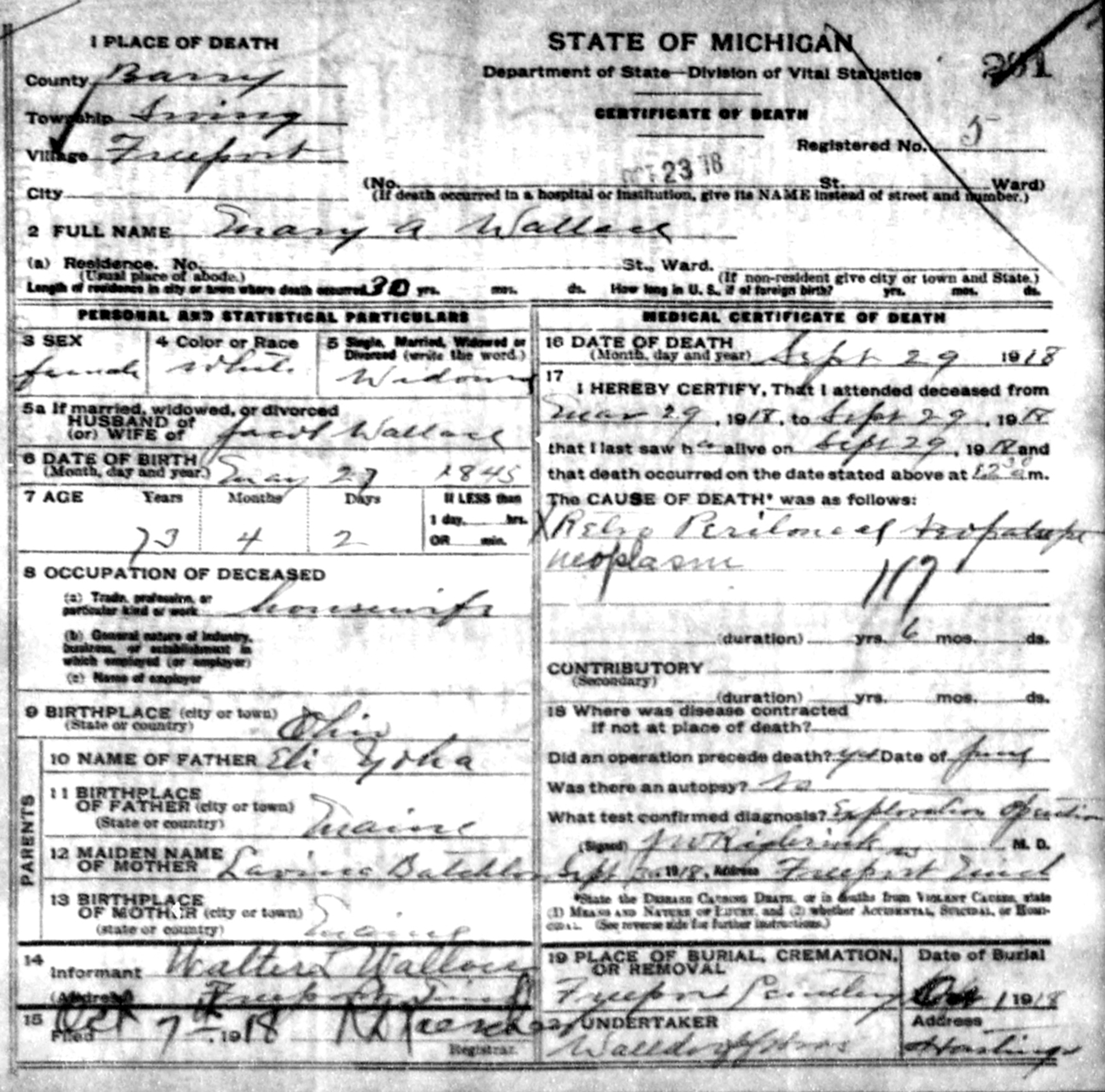9 "Michigan, Deaths and Burials, 1800-1995," database, FamilySearch (https://familysearch.org/search/collection/1675357 : accessed 22 Oct 2013), Name: Mary A. Wallace; Death Date: 29 Sep 1918; Death Place: Freeport, Barry, Mi.