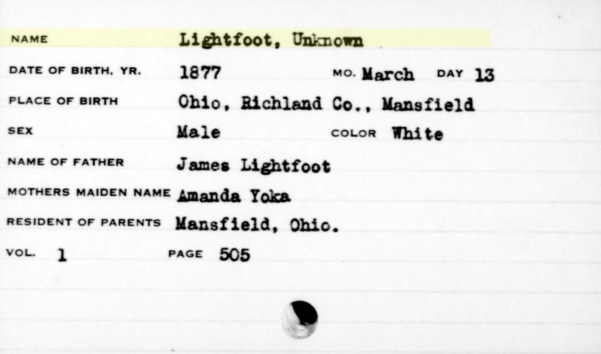 7 "Ohio Births and Christenings, 1821-1962," database, FamilySearch (https://familysearch.org/search/collection/1680845 : accessed 19 August 2020), Lightfoot.