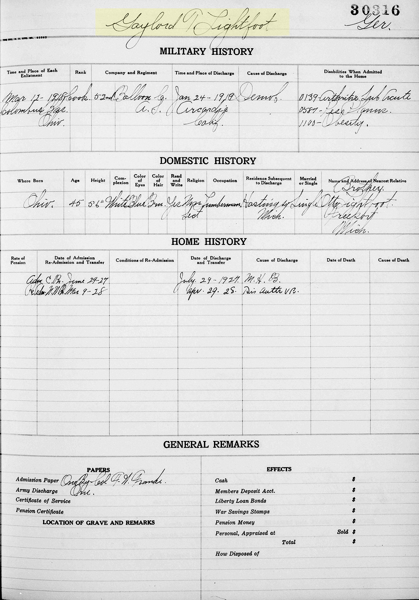 9 "US National Homes for Disabled Volunteer Soldiers, 1866-1938," index and images, FamilySearch (https://familysearch.org/search/collection/1916230 : accessed 26 Oct 2013); Name: Gaylord T Lightfoot; Event Date: 1927; Event Place: Milwaukee, Wisconsin.