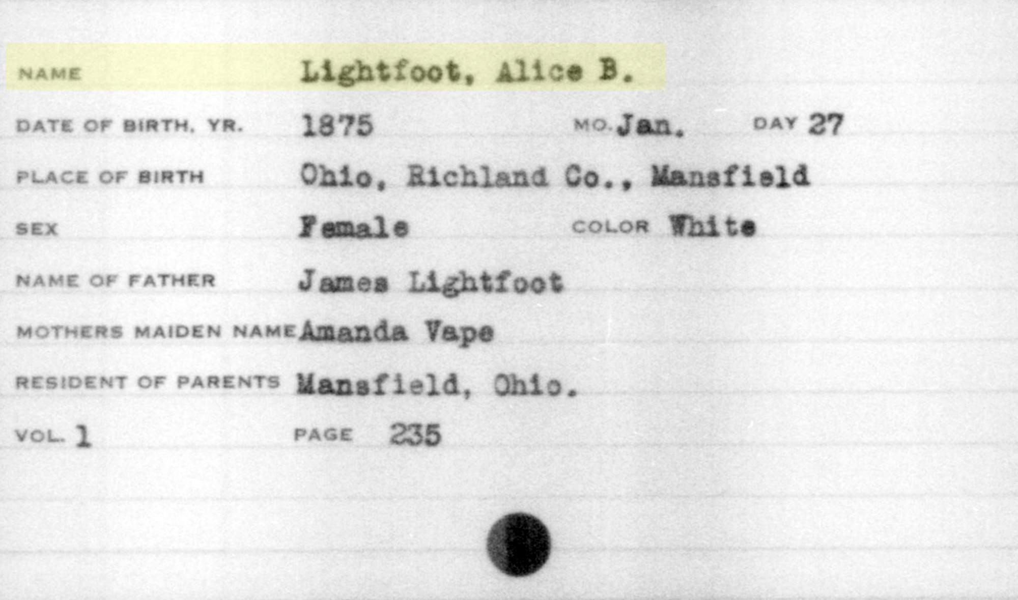 "Ohio, County Births, 1841-2003," database with images, FamilySearch (accessed 27 November 2019); Alice B. Lightfoot, 27 Jan 1875; citing Birth, Mansfield, Richland, Ohio, United States, county courthouses, Ohio; FHL microfilm 541,346.