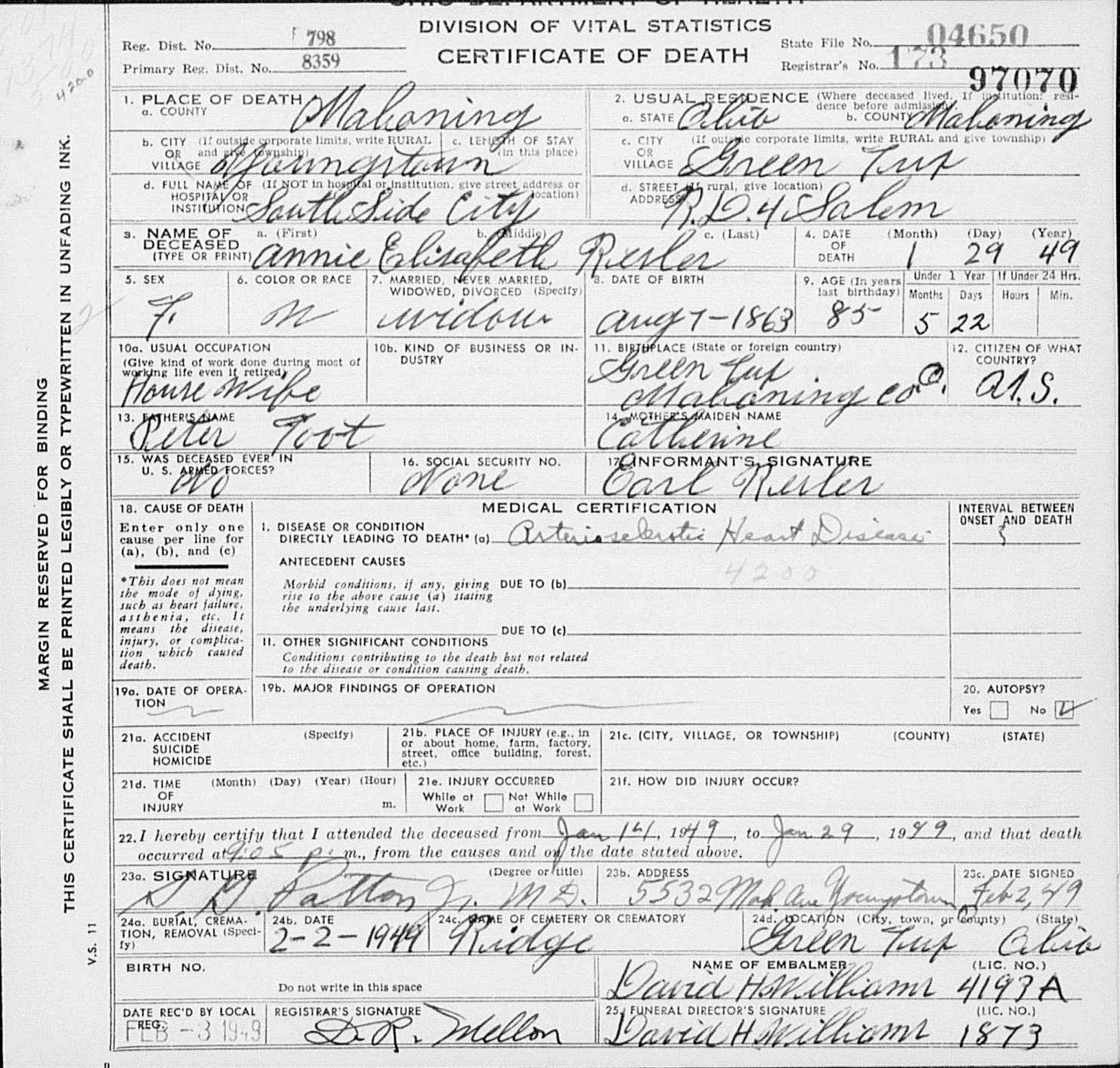 7 "Ohio Deaths, 1908-1953," database with images, FamilySearch.org (accessed 24 May 2021), (https://www.familysearch.org/ark:/61903/1:1:X6BJ-C5X : 24 May 2021), Annie Elisabeth Ruler, 29 Jan 1949; citing, reference certificate; FHL microfilm 2,246,545.