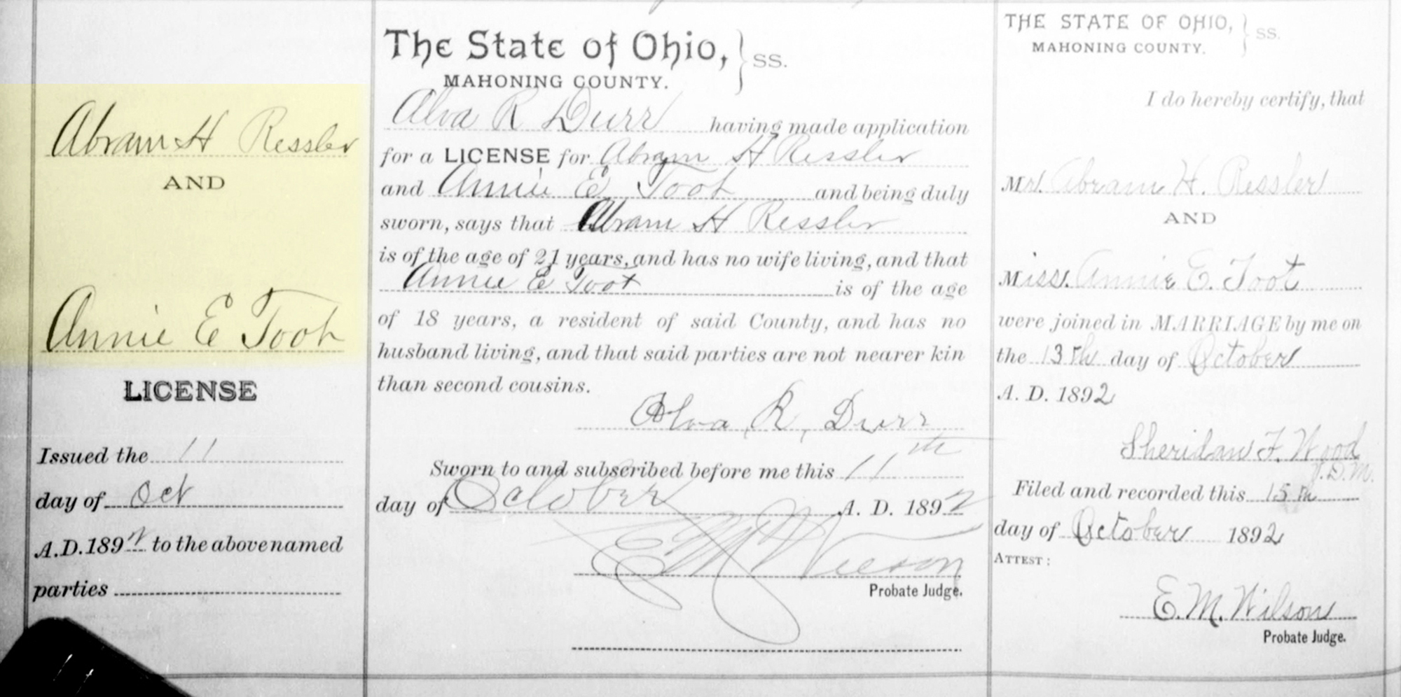 1 "Ohio, County Marriages, 1789-2016," database with images, FamilySearch.org (accessed 23 May 2021); (https://familysearch.org/ark:/61903/1:1:X88F-Z24 : 8 March 2021), Abram H. Ressler and Annie E. Toot, 13 Oct 1892; citing Marriage, Mahoning, Ohio, United States, P420, Franklin County Genealogical & Historical Society, Columbus; FHL microfilm.