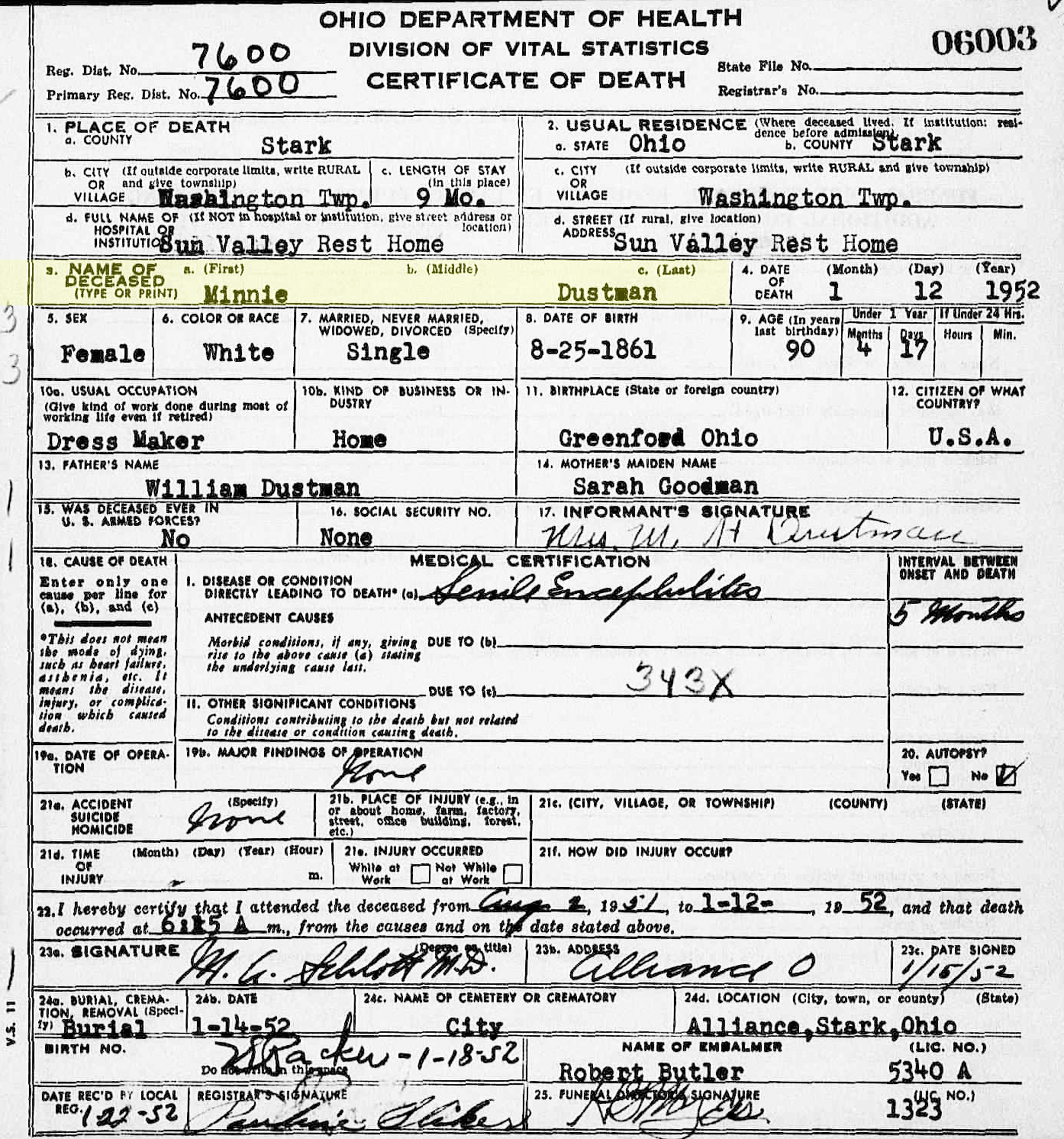 5 "Ohio Deaths, 1908-1953," database with images, FamilySearch.org (accessed 26 May 2021), (https://www.familysearch.org/ark:/61903/1:1:XXS8-PJ9 : 8 March 2021), Minnie Dustman, 12 Jan 1952; citing, reference Certificate; FHL microfilm 2,372,994.