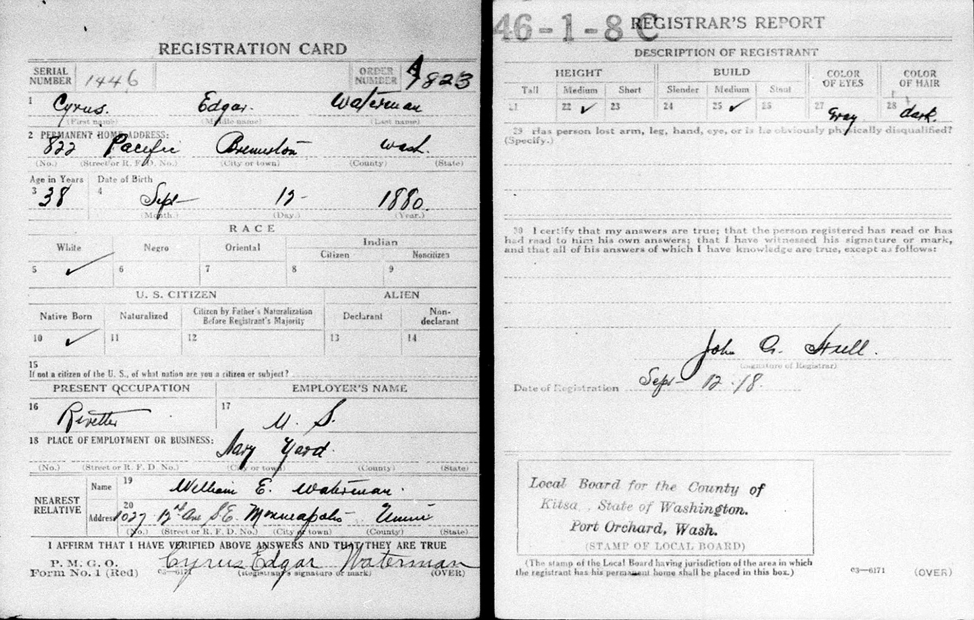 "United States World War I Draft Registration Cards, 1917-1918," database with images, FamilySearch.org (accessed 10 Sep 2014); Name: Cyrus Edgar Waterman; Event Place: Kitsap County, Kittitas County, Washington, United States.
