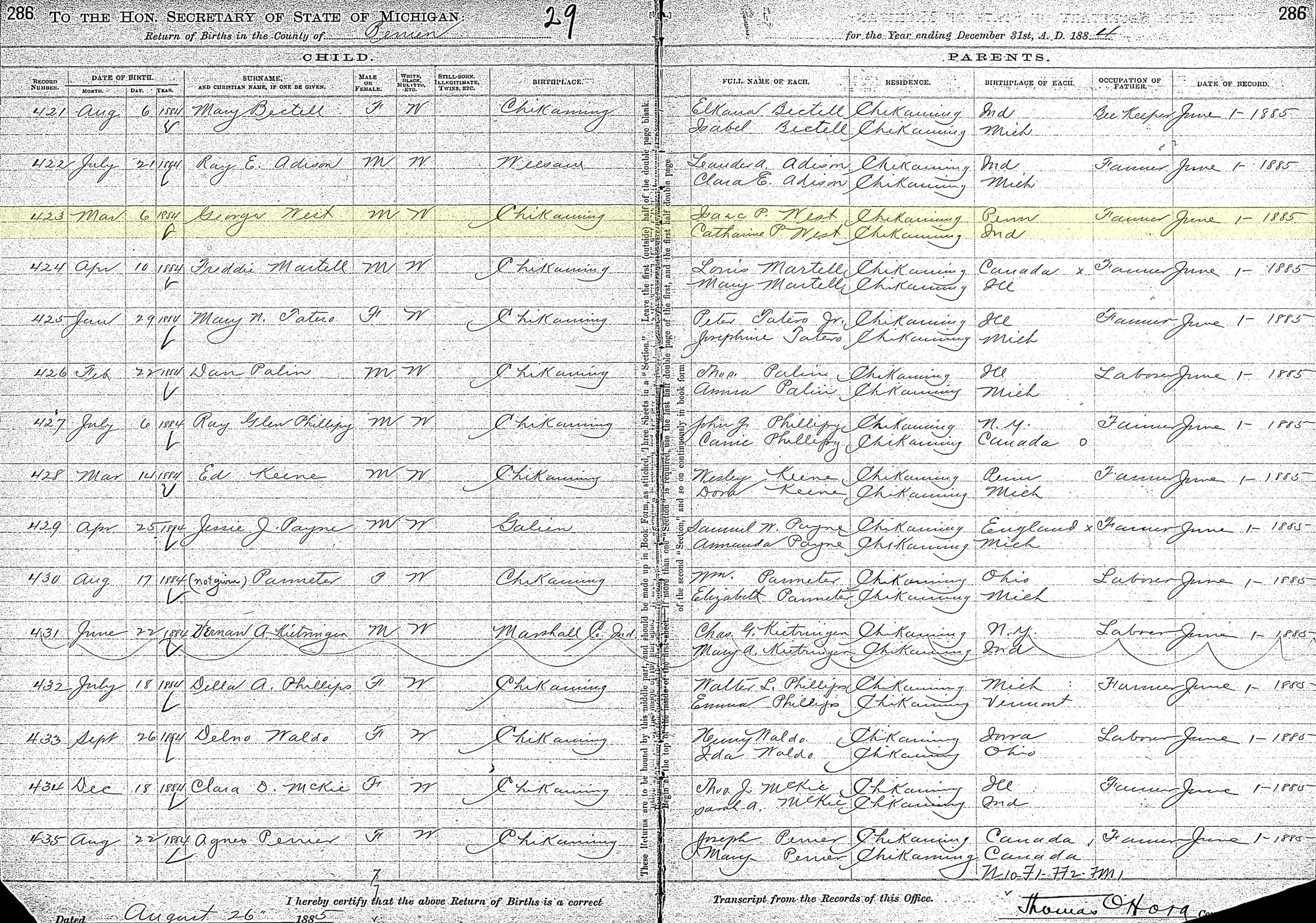 6 "Michigan Births, 1867-1902," database with images, FamilySearch.org (accessed 13 Jun 2014); George West, 06 Mar 1884; citing item 1 p 286 rn 423, Chikaming, Berrien, Michigan, Department of Vital Records, Lansing; FHL microfilm 2,320,699.