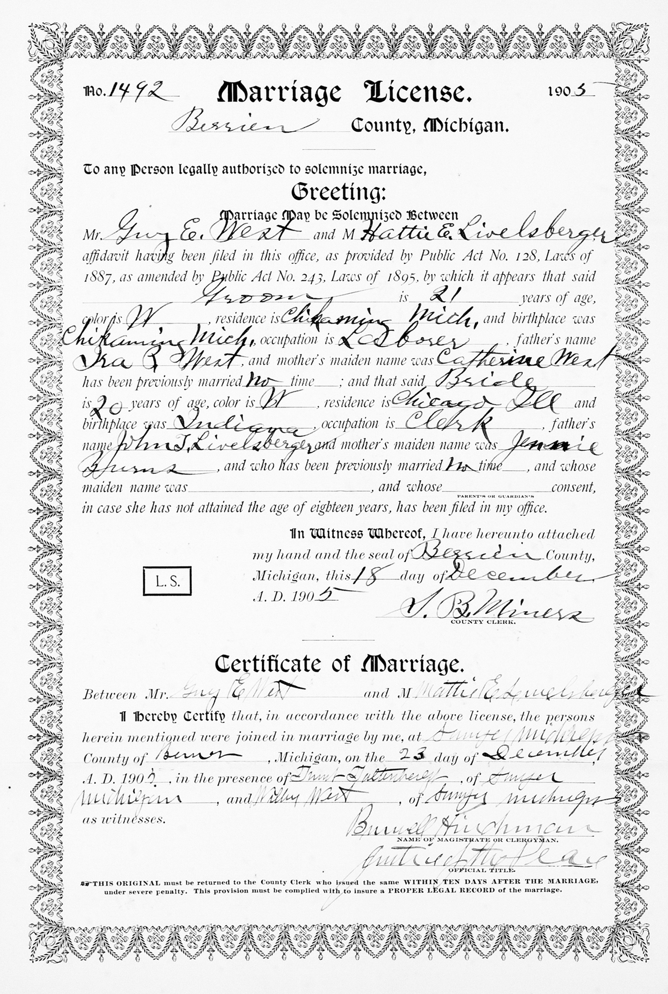 1 "Michigan, County Marriages, 1820-1940," database with images, FamilySearch.org (https://familysearch.org/search/collection/1810350 : accessed 13 Jun 2014); Guy E West and Mattie E Livelsberger, 23 Dec 1905; citing reference ID, various county clerks and libraries, Michigan; FHL microfilm 2,240,539.
