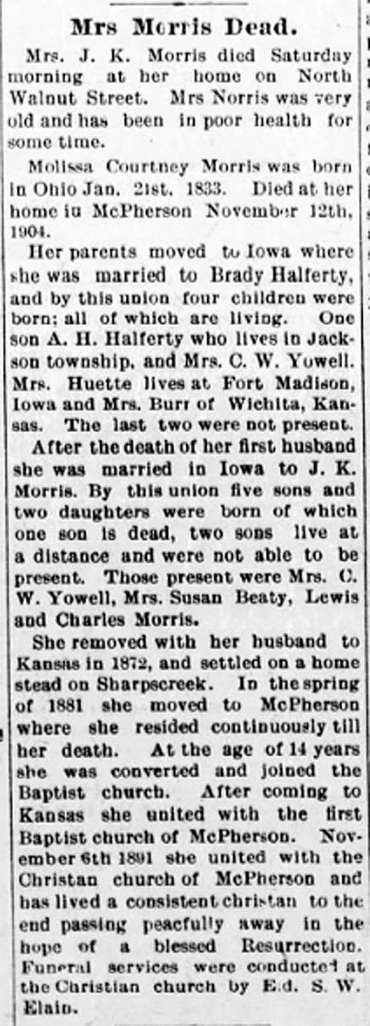 • Her obituary was published in the McPherson Weekly Republican on 18 November 1904 in McPherson, KS. Melissa married Arthur Brady Halferty, son of Arthur Halferty and Maria Lightfoot, on 16 March 1849 in Fort Madison, IA.1 (Arthur Brady Halferty was born on 3 November 1819 in Pennsylvania,7 died on 14 November 1857 in , Lee County, IA 7 and was buried after 14 November 1857 in Fort Madison, IA 7.)