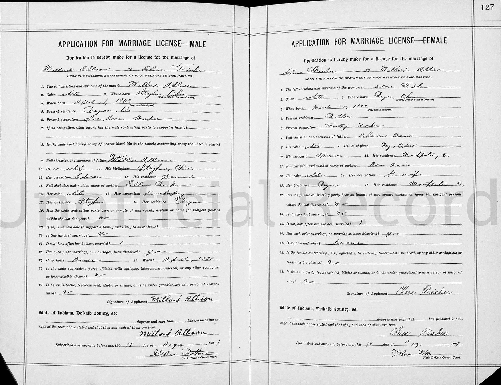 2 1940 U.S. census, population schedule, Bryan, Williams County, Ohio, enumeration district (ED) 86-16, sheet 12B, household 432, Millard Lewis Allison and Clara Dean; index and images, FamilySearch.org (accessed 5 Jun 2019); citing National Archives and Records Administration microfilm T627, roll 3169.