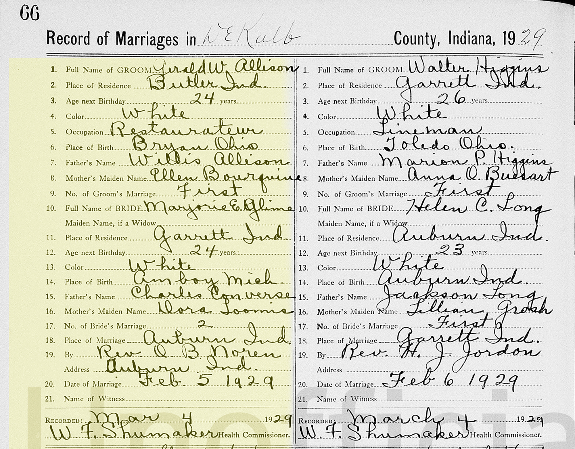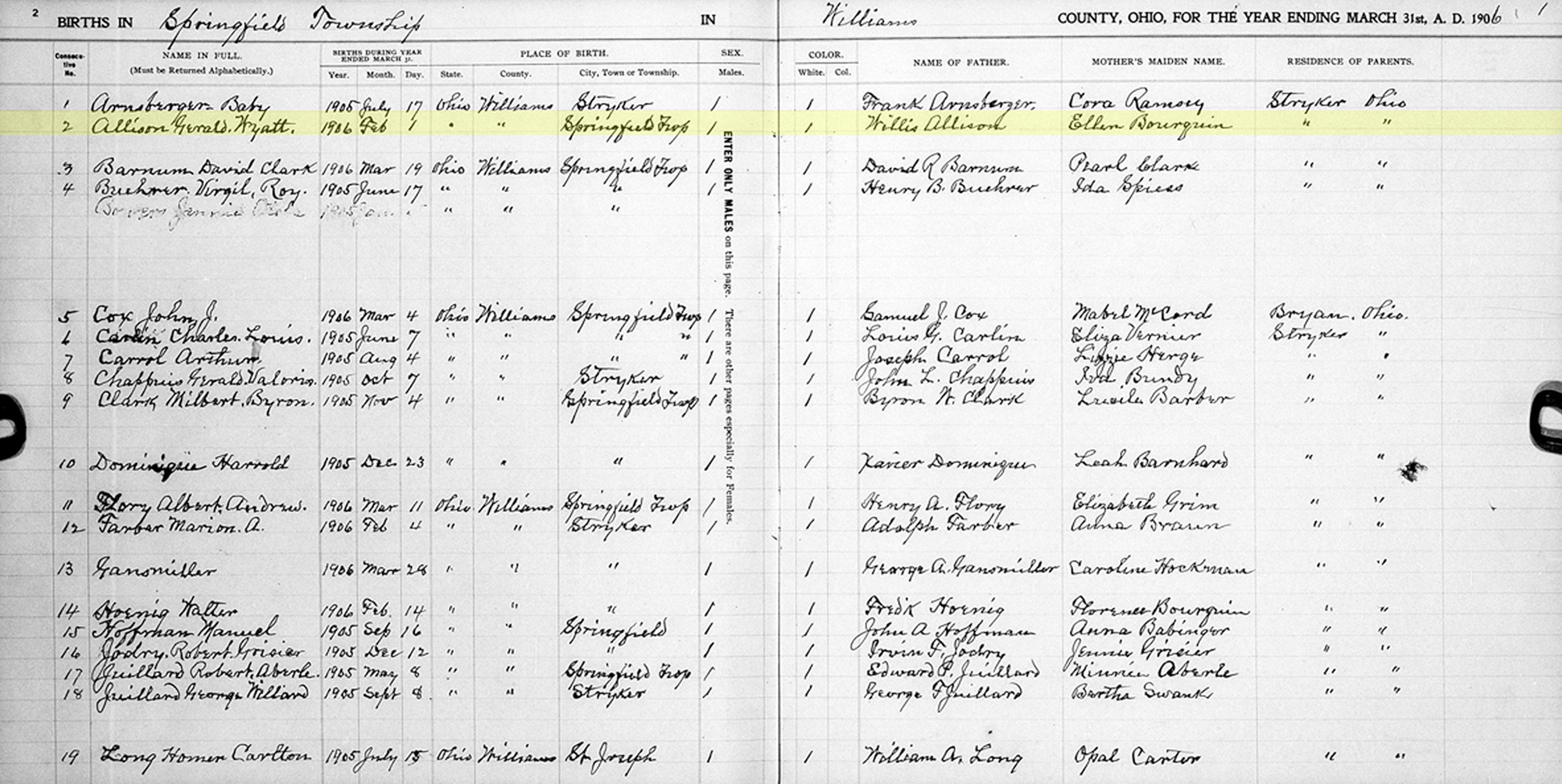 1 1930 U.S. census, population schedule, Bryan, Williams County, Ohio, enumeration district (ED) 17, sheet 2A, dwelling 35, family 39, Gerald Wyatt Allison and Marjorie E. Converse; index and images, FamilySearch.org (accessed 5 Jun 2019); citing National Archives and Records Administration microfilm T626, roll 1891.