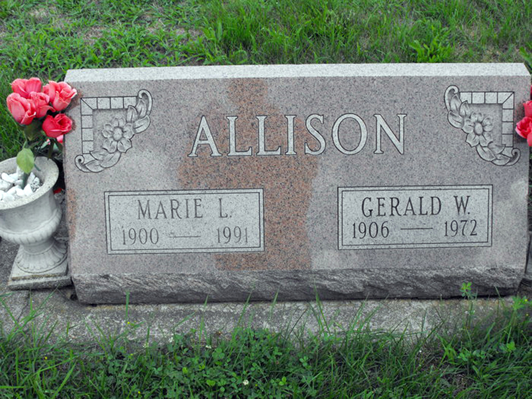 Find A Grave, database and images (https://www.findagrave.com/ ); accessed 05 June 2019), memorial page for Marie Louise Aunier Allison (24 Aug 1900\endash 25 Feb 1991), Find A Grave Memorial no. 95761274, citing Shiffler Cemetery, Pulaski, Williams County, Ohio, USA