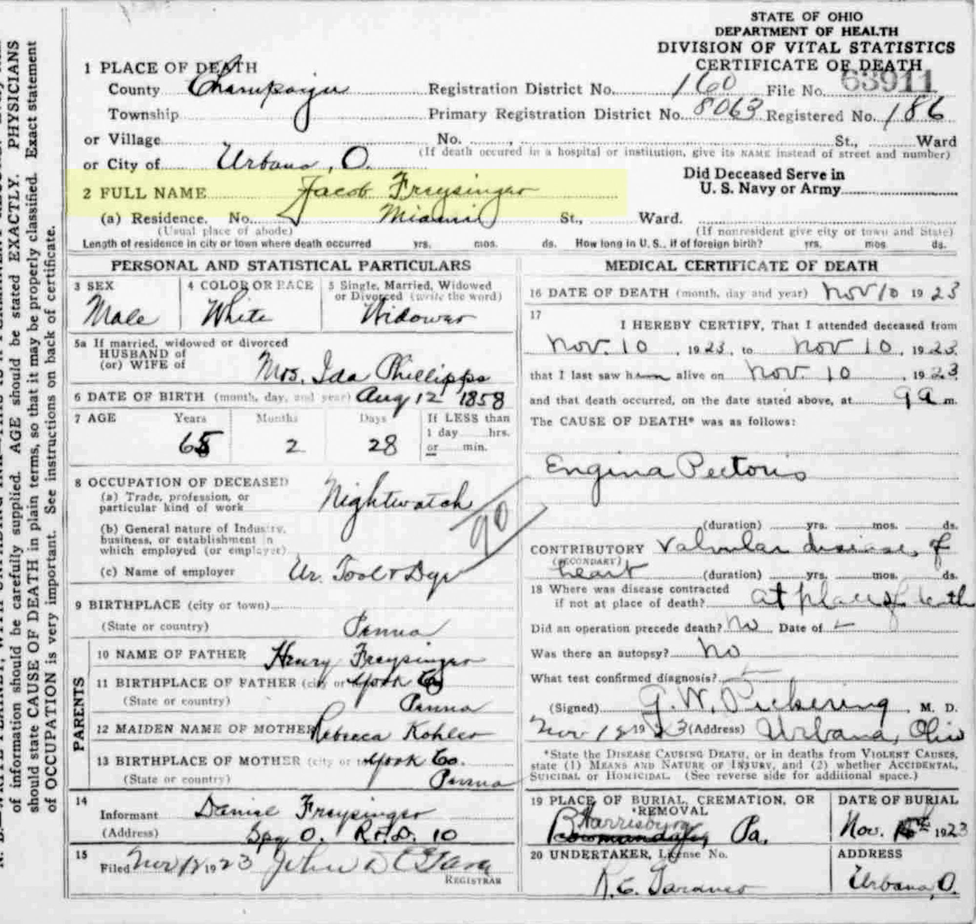 3 "Ohio Deaths, 1908-1953," database with images, FamilySearch.org (accessed 12 January 2021), (https://familysearch.org/ark:/61903/1:1:XDBL-K2B : 15 August 2019), Jacob Freysinger, 10 Nov 1923; citing Urbana, Champaign, Ohio, reference fn 63911; FHL microfilm 1,992,394.