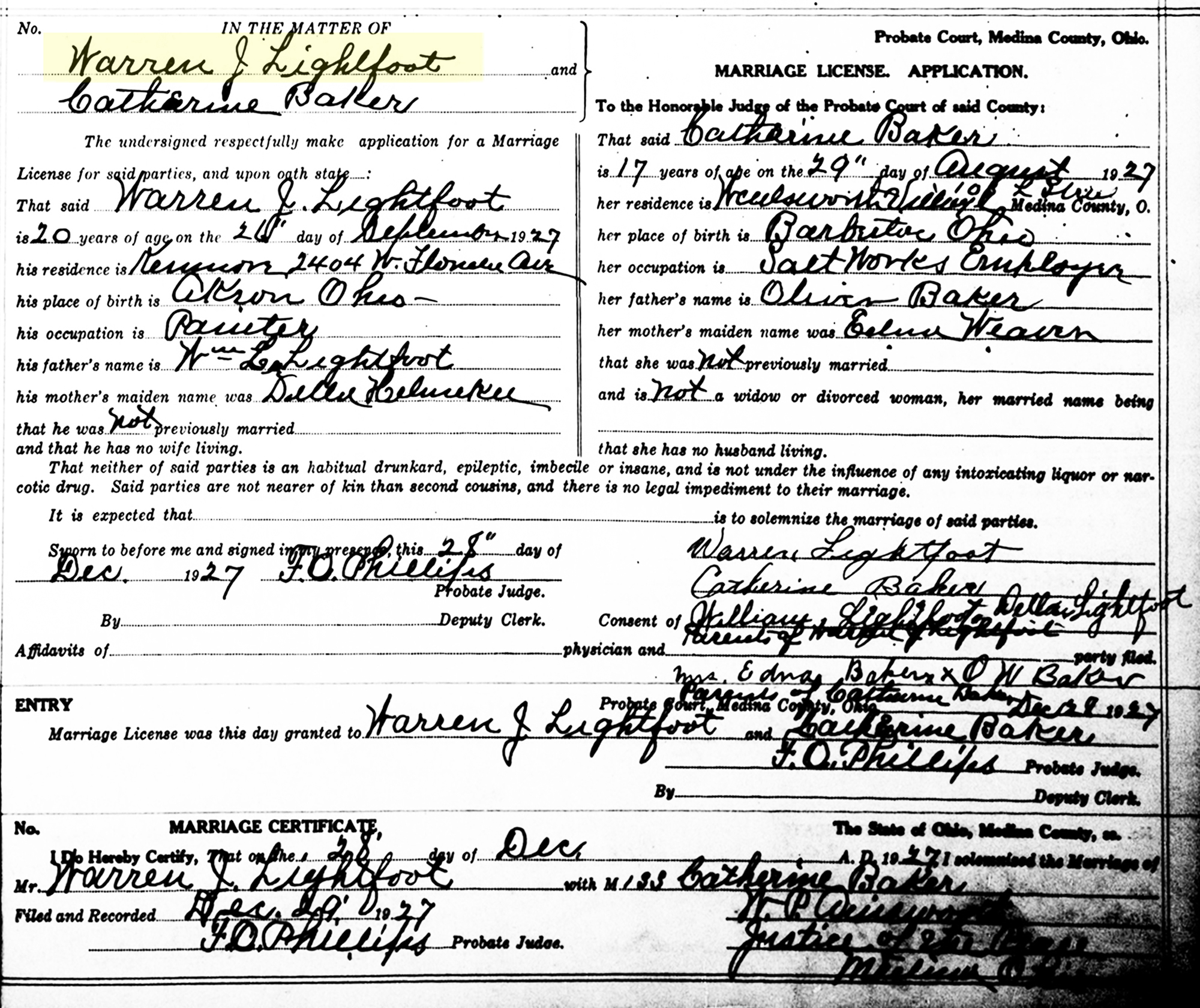 2 "Ohio, County Marriages, 1789-2016," database with images, FamilySearch.org (accessed 27 Dec 2019); Warren J. Lightfoot and Miss Catherine Baker, 28 Dec 1927; citing Marriage, Medina, Ohio, United States, page17, Franklin County Genealogical & Historical Society, Columbus; FHL microfilm.