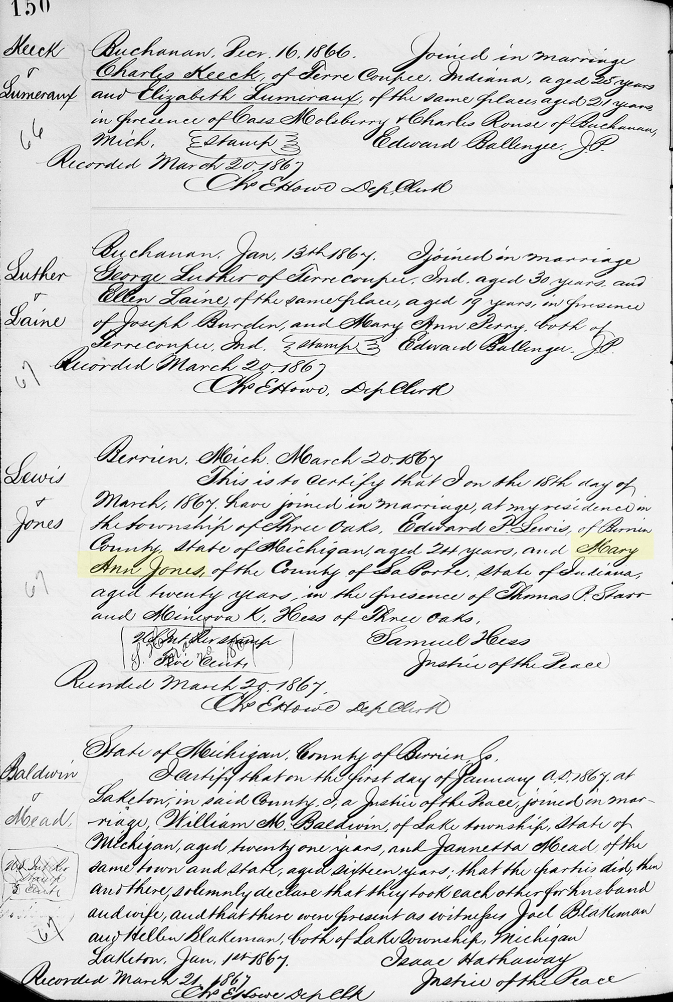 1 "Michigan, County Marriages, 1820-1940," database with images, FamilySearch.org (https://familysearch.org/search/collection/1810350 : accessed 30 Nov 2019); Edward P. Lewis and Mary Ann Jones, 18 Mar 1867; citing reference ID P 150, various county clerks and libraries, Michigan; FHL microfilm 945,410.