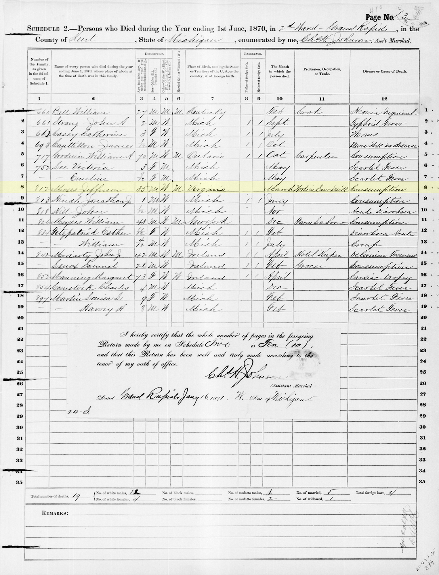 Name: Jefferson Moses Event Type: Death Event Date: Mar 1870 Event Place: Grand Rapids, Kent, Michigan, United States Event Place: Grand Rapids, Kent, Michigan, United States Gender: Male Age: 35 Race: W Birth Year (Estimated): 1835 Birthplace: Virginia Affiliate Publication Number: T1164 Affiliate Publication Title: Nonpopulation Census Schedules for Michigan, 1850-1880. Affiliate Film Number: 75